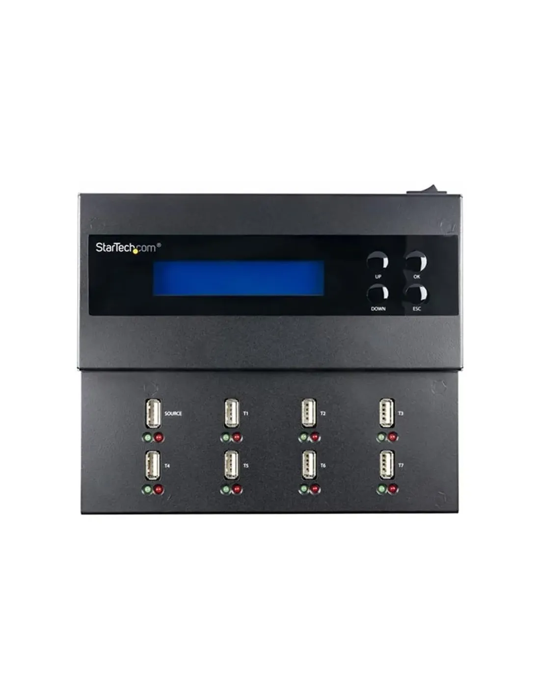 Características del StarTech.com Clonador y Borrador Autónomo de Unidades de Memoria Flash USB 1:7El clonador y borrador autónomo de USB StarTech.com 1:7 está diseñado para entornos profesionales donde se requiere una duplicación rápida y simultánea de unidades USB. Ideal para departamentos de IT, centros de formación o producción de contenido, este dispositivo permite clonar o borrar hasta 7 memorias USB al mismo tiempo, sin necesidad de un ordenador.Duplicación rápida y eficienteGracias a su arquitectura autónoma, el sistema alcanza una velocidad de copia de hasta 1.5 GB por minuto por puerto, lo que permite una producción ágil incluso en volúmenes elevados. La función de borrado avanzado garantiza la limpieza segura de datos, ideal para entornos donde se manejan informaciones sensibles.Duplicación simultánea 1:7 sin PCVelocidad de copia: hasta 1.5 GB/min por unidadCapacidad máxima soportada por unidad: 2 TBDiseño compacto y orientado al rendimientoEste dispositivo presenta un formato compacto y resistente, con 8 indicadores LED que informan del estado de cada puerto en tiempo real. Incorpora un chipset Xilinx Spartan XC3S700A y un búfer de 128 MB para asegurar operaciones estables y de alto rendimiento. Su estructura ligera lo hace ideal para uso en diferentes ubicaciones.Carcasa de 16 x 19 x 3.46 cmPeso ligero: 1 kgCompatible con TAA y regulaciones FCC, RoHS, RCM, WEEEConectividad y alimentación fiableEquipa 8 puertos USB 2.0 tipo A y funciona mediante un adaptador externo de corriente que opera entre 120 y 230 V. Su consumo energético en funcionamiento es de 108 W, lo que garantiza un equilibrio entre potencia y eficiencia.Interfaces: 8 x USB 2.0 Tipo AFuente de alimentación externa incluidaVoltaje: CA 120/230 V, consumo: 108 WFuncionamiento estable en distintos entornosDiseñado para un uso continuo y confiable, este clonador USB tiene un MTBF de 8760 horas y opera en un rango amplio de temperatura y humedad, lo que lo hace apto para oficinas, laboratorios o entornos industriales ligeros.Temperatura de funcionamiento: de 5 °C a 45 °CHumedad operativa: 20% - 80%MTBF: 8760 horasOtras especificacionesIndicadores LED de estado por puertoDispositivos integrados: 7 módulos simultáneosUbicaciones compatibles: Norteamérica, Japón, Reino Unido, Europa, Australia y Nueva Zelanda