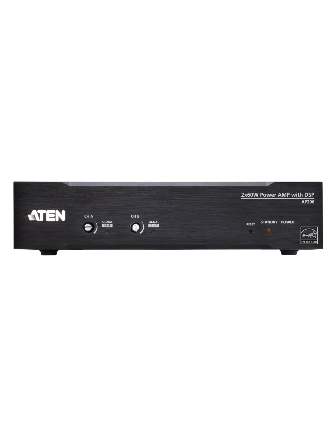 ATEN AP206 es un amplificador de dos canales equipado con DSP que proporciona 60 W por canal en una carcasa compacta. La compatibilidad con entradas de nivel de línea equilibradas/no equilibradas y la capacidad de alimentar sistemas de altavoces de baja impedancia de 4 ohmios o de línea de 70/100 V (en modo puente) han hecho que AP206 se adapte a una amplia gama de aplicaciones de megafonía. Configurable a través de una intuitiva WebGUI, el DSP integrado permite ecualizador de altavoz, ecualizador de 5 bandas, retardo, limitador y hasta 20 preajustes para una sintonización precisa y una amplia protección del sistema de audio. La elevación de la toma de tierra elimina los zumbidos no deseados del circuito de alimentación. La experiencia de sonido envolvente se ofrece sin comprometer la eficiencia energética gracias al diseño de clase D del amplificador y a la calificación ENERGY STAR, lo que permite conservar la energía y reducir los costes operativos. El modo de espera automático personalizable permite al AP206 conmutar automáticamente a "reposo" cuando el nivel de señal es inferior a -40 / -50 dBu durante 10 / 15 / 25 minutos.