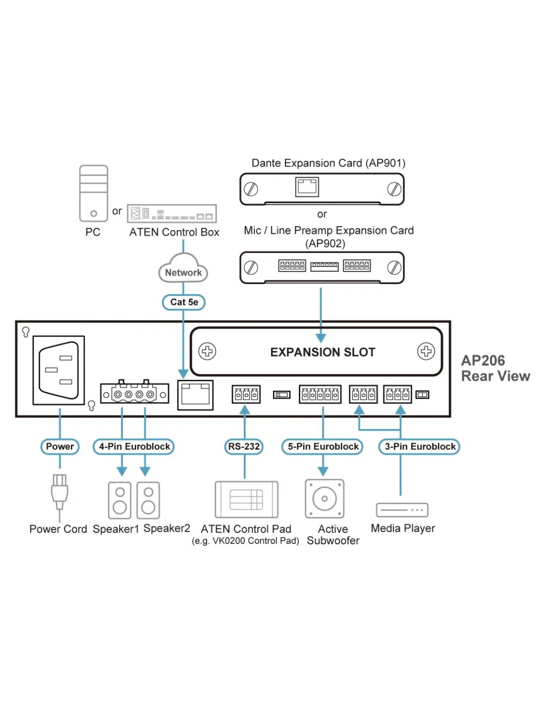 Diseñado para ofrecer la máxima flexibilidad, el AP206 cuenta con una ranura de expansión para conectar la tarjeta de expansión AP901 2-CH Dante para que el sistema de sonido sea compatible con la red Dante o la tarjeta de expansión AP902 2-CH Mic/Line Pre-AMP para recibir dos canales de señales de entrada de micrófono/línea. El amplificador también puede integrarse con Sistemas de control VK mediante conexión RS-232 y ethernet para un control exhaustivo incluso a distancia. El hardware de montaje está disponible para montaje en bastidor o en superficie en función de las necesidades de instalación. Con un amplio conjunto de características, el AP206 garantiza una amplificación fiable con calidad de audio profesional y alta eficiencia energética para cualquier aplicación de nivel empresarial que requiera refuerzo y distribución de sonido de alta calidad.