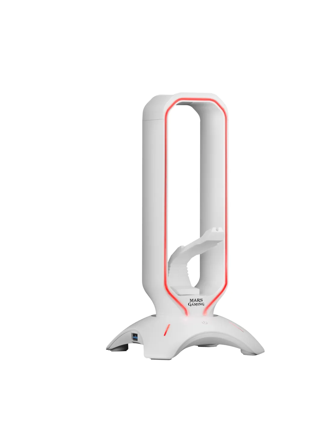 Características del Soporte Mars Gaming MHHPRO WhiteEl Mars Gaming MHHPRO White es un accesorio 3 en 1 diseñado para optimizar tu espacio y potenciar la estética de tu setup gaming. Ofrece soporte para auriculares, bungee para ratón y un hub USB 3.0 con dos puertos, todo integrado en un diseño compacto con iluminación RGB Flow. Su estructura ergonómica y funcional lo convierte en una solución ideal para gamers que buscan orden, conectividad y estilo.Soporte multifunción 3 en 1 con diseño compactoEste soporte combina tres funcionalidades clave en un solo dispositivo: sostiene tus auriculares, organiza el cable del ratón con un sistema bungee ergonómico y te proporciona dos puertos USB 3.0 para conectar periféricos adicionales. Todo ello en un formato vertical fabricado en ABS con base elevada para optimizar el espacio en tu escritorio.Soporte vertical para auriculares con estructura robustaBungee con ranura de goma para sujeción del cable del ratónDiseño compacto que reduce el desorden en tu setupIluminación RGB Flow con control TouchEl MHHPRO White incorpora una tira LED con efectos RGB Flow dinámicos y hasta 10 modos de iluminación, incluyendo 7 colores sólidos. Gracias a su sistema de control Touch, puedes cambiar el modo de luz con solo un toque o apagarla manteniendo presionado para ahorrar energía.8 efectos RGB Flow automáticos7 colores sólidos seleccionablesControl táctil para alternar modos o apagar iluminaciónHub USB 3.0 integrado: conectividad al instanteIncluye un hub con 2 puertos USB 3.0 de alta velocidad (hasta 5 Gbit/s), ideal para conectar periféricos como teclado, ratón, altavoces o unidades de almacenamiento sin necesidad de acceder a los puertos traseros del PC.2 puertos USB 3.0 de alta velocidad (5 Gbit/s)Acceso fácil a tus dispositivos desde el escritorioCompatible con cualquier marca de periféricosBungee ergonómico para movimientos sin restriccionesEl sistema bungee del MHHPRO permite mantener el cable del ratón bien sujeto, eliminando tirones accidentales durante tus partidas. Mejora la precisión y la libertad de movimiento, especialmente en juegos que requieren reacciones rápidas.Ranura ajustable para el cable del ratónEvita enganches y enredos en el escritorioMayor control en sesiones gaming intensasDiseño minimalista y robustoFabricado en plástico ABS resistente y con un peso equilibrado de 317 g, el MHHPRO combina funcionalidad y estabilidad. Su diseño blanco con iluminación personalizable se adapta perfectamente a setups modernos y gaming.Color: BlancoPeso: 317 gMaterial: ABS de alta resistenciaOtras especificacionesTipo de producto: Soporte para auricularesIluminación de color: Azul, Verde, Rojo (y RGB Flow)Tipo de control: Sensor Touch táctilVelocidad de transferencia: Hasta 5 Gbit/s