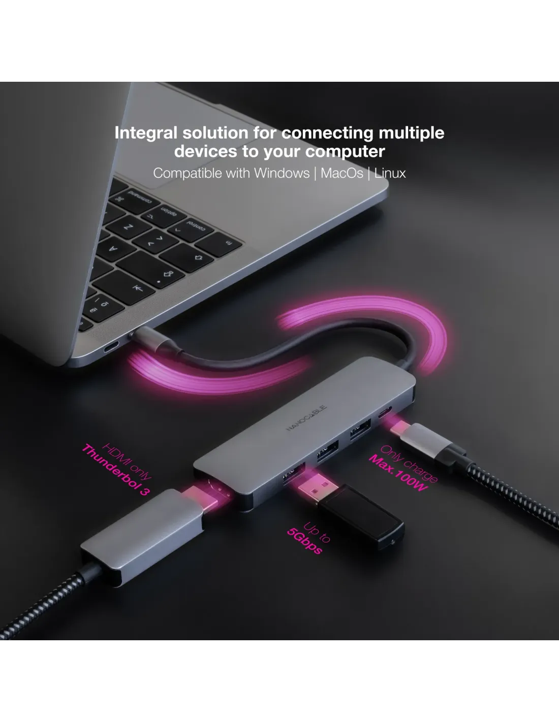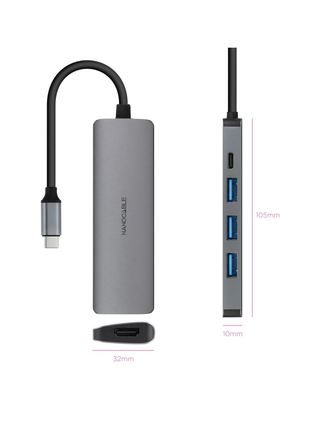 Nanocable Hub USB-C 5 en 1, Conversor USB-C 3.1 a 3xUSB-A 3.0 + USB-C PD + HDMI, Aluminio, Gris, 18 cm, Alámbrico, USB 3.2 Gen 1 (3.1 Gen 1) Type-C, 100 W, Gris, 5 Gbit/s, 4K Ultra HD