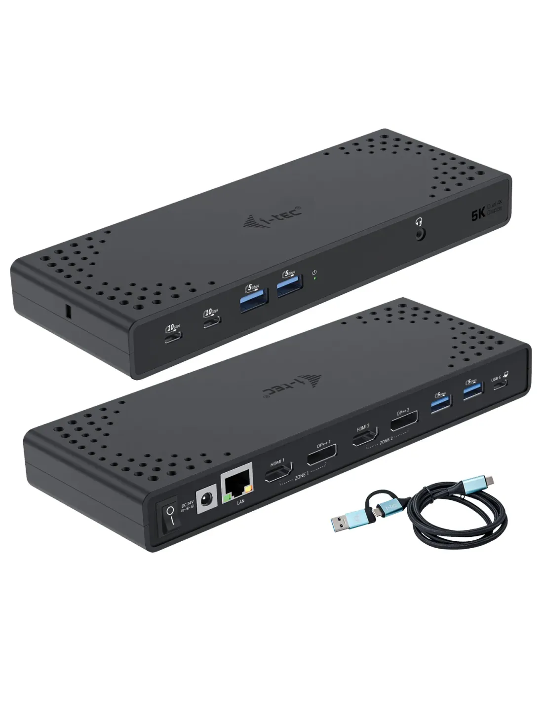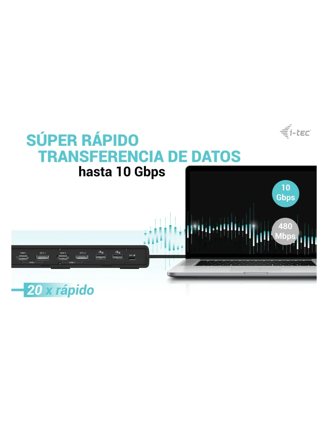 Estación de acoplamiento i-tec USB Tipo C para Ordenador portátil/Tableta/Monitor - Negro - 2.0 Pantallas admitidas - 4K, 5K - 3840 x 2160, 5120 x 2880 - 7 x puertos USB - 4 x Puertos USBTipo-A - USB Tipo-A - 3.0 x Puertos USB Tipo-C - USB Tipo-C - 1 x Puertos RJ-45 - Red (RJ-45) - 2 x Puertos HDMI - HDMI - 2 x DisplayPorts - DisplayPort - Cableado - Gigabit Ethernet - Windows10, Windows 11, Mac OS X, Android 5.0 Lollipop, Ubuntu 14.04, Ubuntu 16.04, Ubuntu 18.04, Ubuntu 19.04, Ubuntu 17.Base de conexión universal compatible con portátiles y tabletas USB-C, USB-A y Thunderbolt.2x DisplayPort y 2x HDMI compatibles con hasta dos pantallas 4K/60Hz (también válido para la plataforma Apple M1/M2) o una pantalla 5K/60Hz.6x puertos USB que incluyen 4x USB-A 3.0 (1x carga rápida BC 1.2) y 2x USB-C Gen2 (10 Gbps), lo que facilita la conexión de múltiples dispositivos y periféricos USB para una transferencia dedatos superrápida.Proporciona hasta 100 W de Power Delivery para portátiles y tabletas compatibles con USB-C y Thunderbolt. El dispositivo anfitrión debe ser compatible con USB-C Power Delivery.GLAN Ethernet admite velocidades de red de 10/100/1000 Mbps, lo que proporciona una conectividad a Internet robusta y de alta velocidad.Tomas de entrada y salida de audio independientes de 3,5 mm para facilitar la conexión de auriculares o altavoces.Soporte VESA disponible para ayudarle a mantener su escritorio ordenado y deshacerse de los cables, y una ranura K-lock para mayor seguridad.