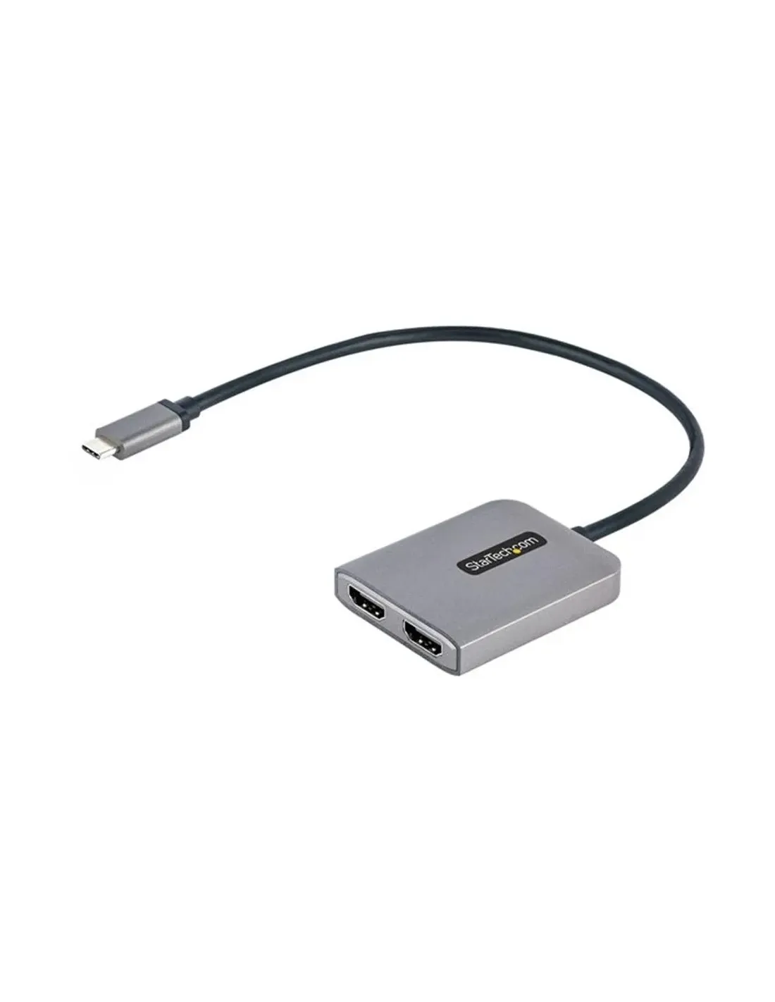 Características del StarTech.com Hub MST USB C a 2x HDMI 4KEl hub USB-C a HDMI de StarTech.com es una solución práctica y eficiente para quienes necesitan ampliar su espacio de trabajo con múltiples pantallas. Diseñado para entornos profesionales y domésticos, permite conectar hasta dos monitores HDMI con resolución 4K desde un único puerto USB Tipo C compatible con modo alternativo DisplayPort. Su compatibilidad con tecnología MST lo convierte en una herramienta ideal para mejorar la productividad.Expansión multipantalla en 4KGracias a la tecnología Multi Stream Transport (MST), este adaptador permite conectar dos pantallas HDMI de forma simultánea, ofreciendo una experiencia visual fluida y de alta calidad. Es perfecto para tareas multitarea, edición de contenido o entornos de oficina donde se requiere mayor espacio visual.Salida dual HDMIResolución máxima de 3840 x 2160Frecuencia de actualización de hasta 60 HzCompatibilidad avanzada y alto rendimientoEste hub está preparado para ofrecer alto rendimiento gráfico y de audio, siendo compatible con DisplayPort 1.4 y tecnologías avanzadas como DSC. Además, soporta audio envolvente 7.1, lo que garantiza una experiencia multimedia completa tanto en imagen como en sonido.Compatible con DisplayPort 1.4Soporte para Display Stream Compression (DSC)Audio HBR3 y sonido envolvente 7.1Diseño compacto y conectividad sencillaSu diseño compacto y ligero facilita el transporte y la instalación en cualquier entorno. Con conexión directa mediante USB-C macho y salidas HDMI hembra, es una solución plug & play ideal para portátiles compatibles con Windows.Conector USB-C de 24 pines (macho)2 puertos HDMI tipo A de 19 pines (hembra)Dimensiones: 10.5 x 4.3 x 1.4 cmCompatibilidad y construcción fiableEl adaptador está diseñado para funcionar con Windows 10 y 11, garantizando una integración fluida con sistemas actuales. Además, cumple con normativas como RoHS y cuenta con una garantía de 3 años, asegurando durabilidad y tranquilidad en su uso.Sistema operativo compatible: Windows 10 / 11Cumplimiento de normativa RoHSGarantía limitada de 3 añosOtras especificacionesColor: GrisPeso: 55 gPeso con embalaje: 110 gDimensiones del embalaje: 17 x 14.2 x 3 cm