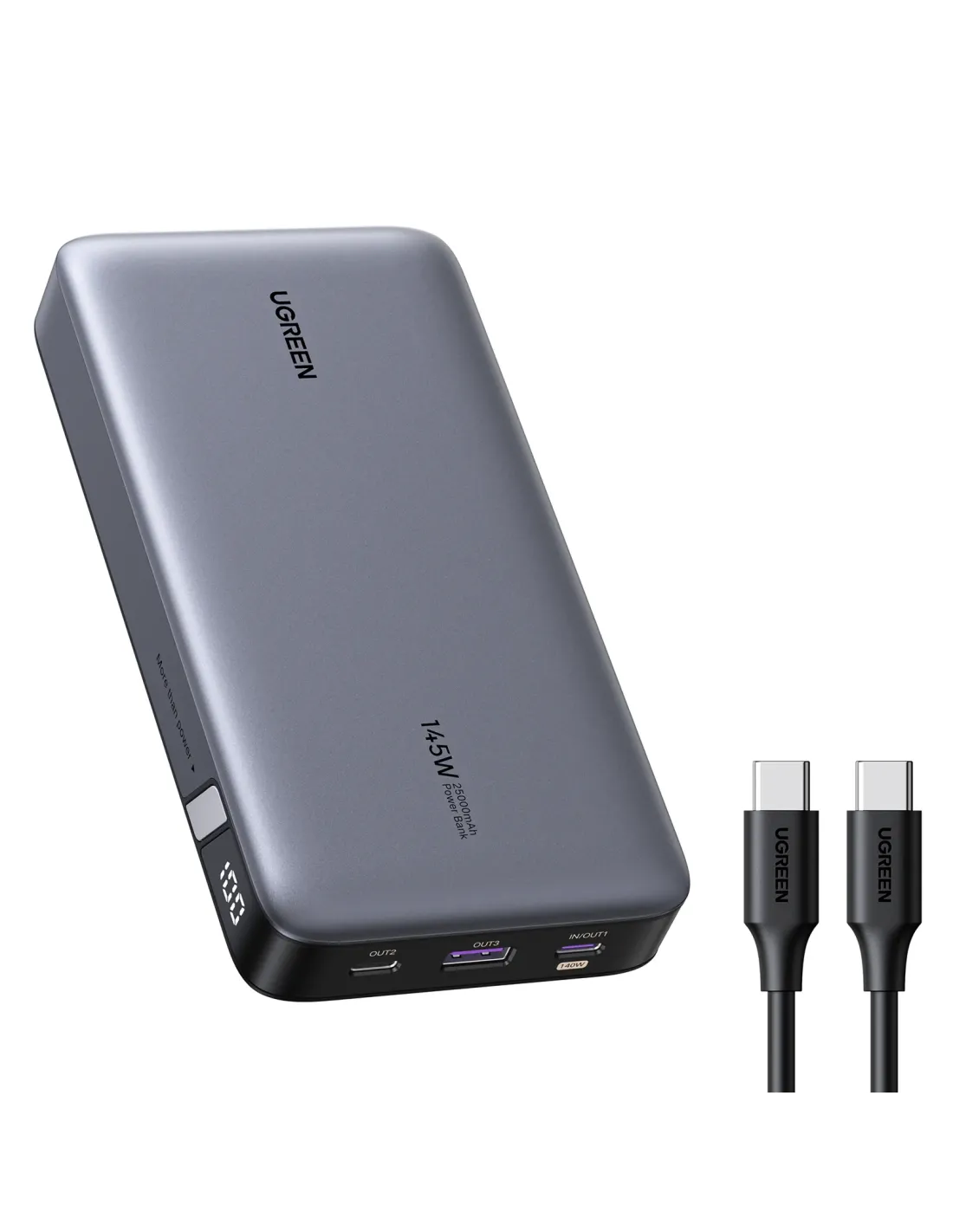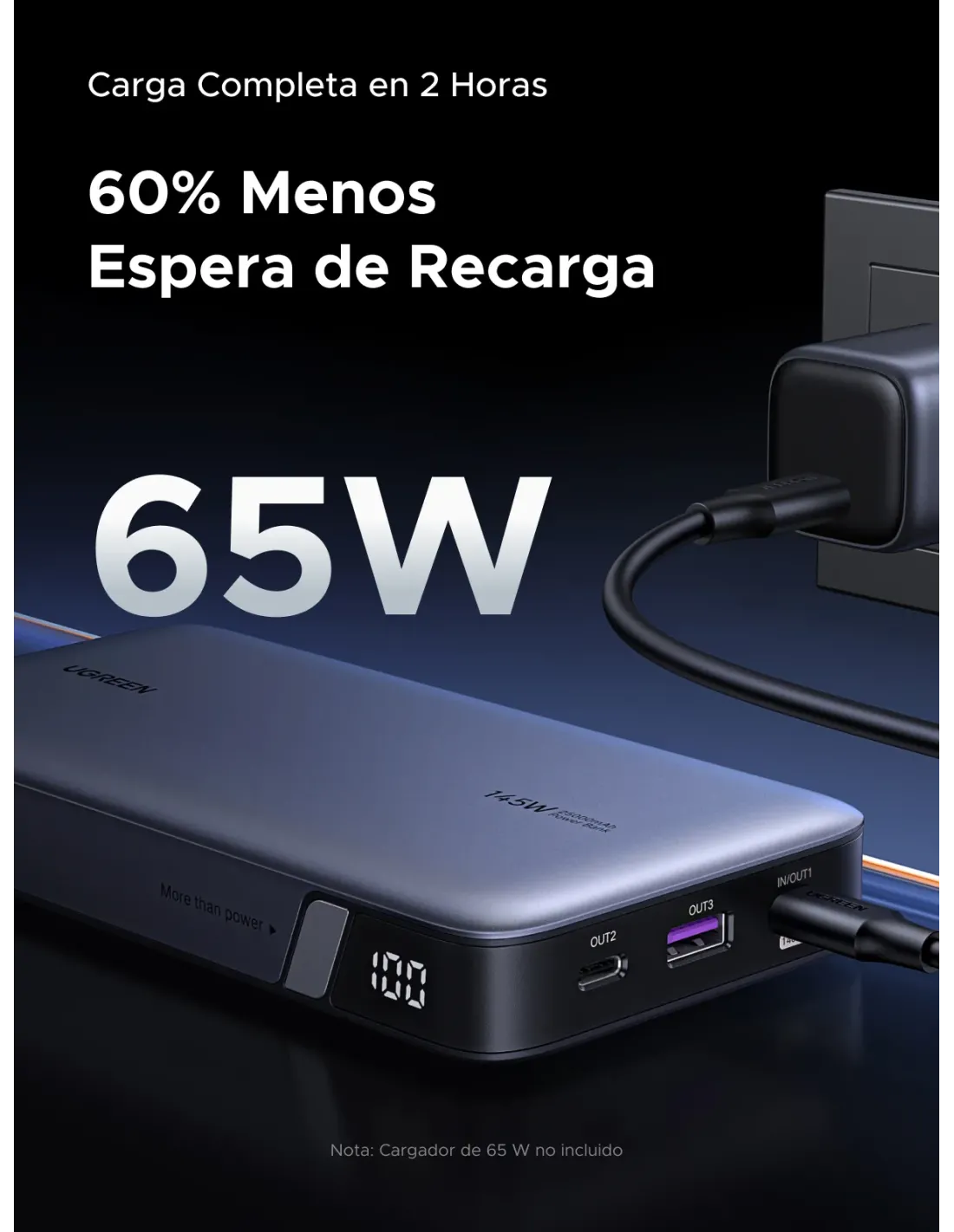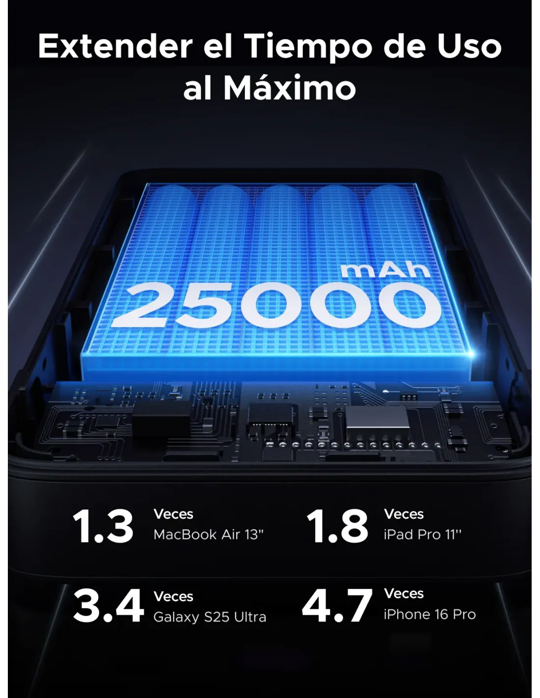 [Grande capacidade de 25000 mAh] Com o banco de energia UGREEN de 25000 mAh, pode usar o MacBook Pro de 14" até 1,3 vezes, Galaxy S24 Ultra até 3,0 vezes e iPhone 16 até 5,6 vezes para se manter sempre fluxo.