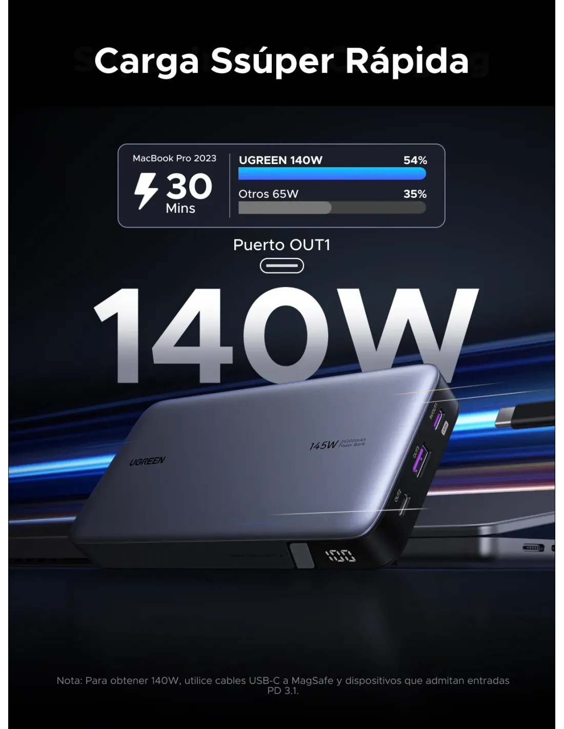 [Carregamento rápido de 145W] Com as mais recentes tecnologias PD3.0 e QC3.0, pode atingir uma velocidade de carregamento super rápida de 140 W de uma só porta, que carrega 56% do MacBook Pro em 30 minutos e 50% do iPhoone 16 em 30 minutos. Use 2 portas USB C simultaneamente, este banco de energia pode oferecer uma potência de até 145 W no total.