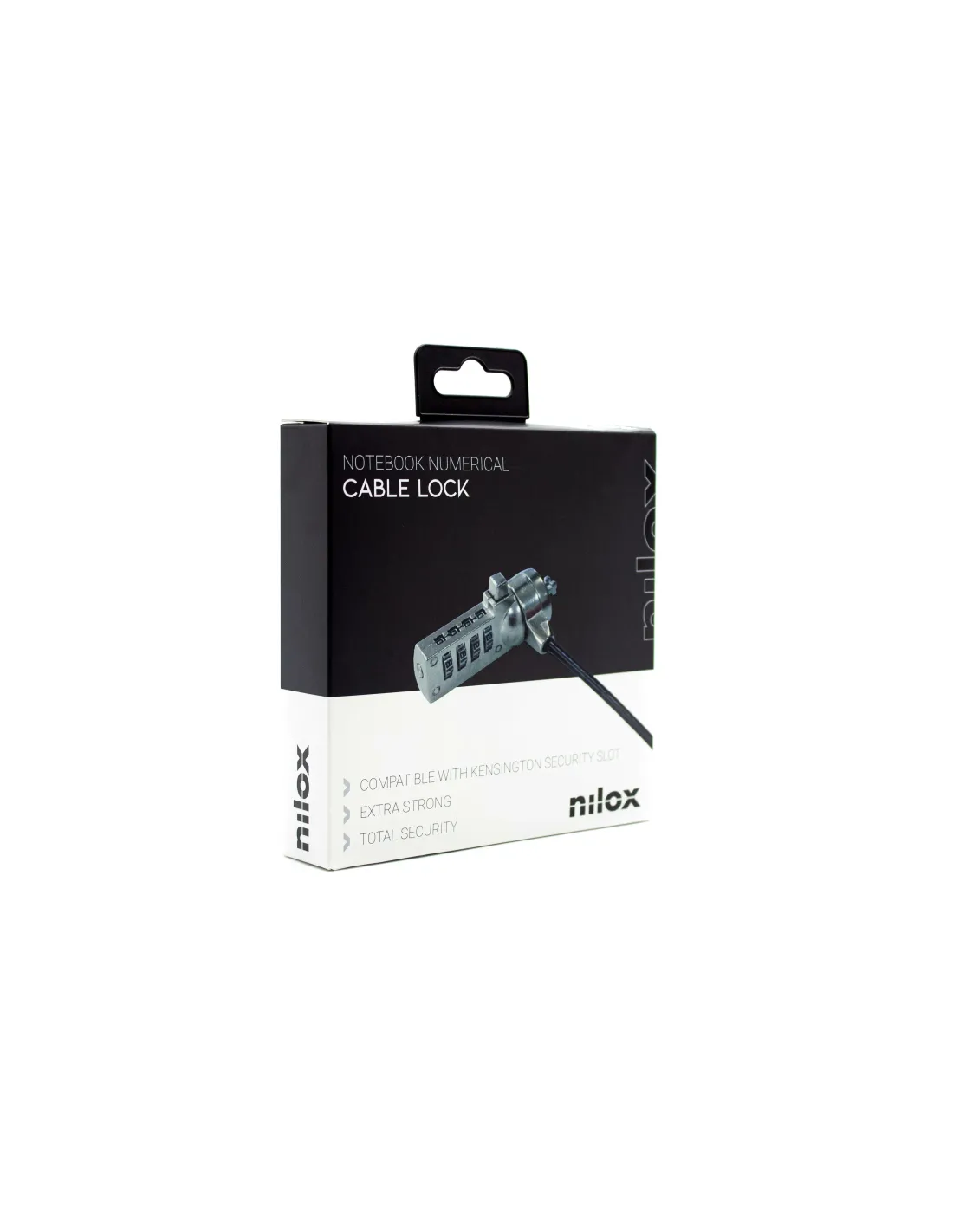 Nilox Candado de seguridad con combinación 1.80m. Color del producto: Negro, Mejores usos: Portátil, PC, Tipo de candado: Cerradura con combinación. Longitud de cable: 1,8 m, Diámetro de cable: 4 mm