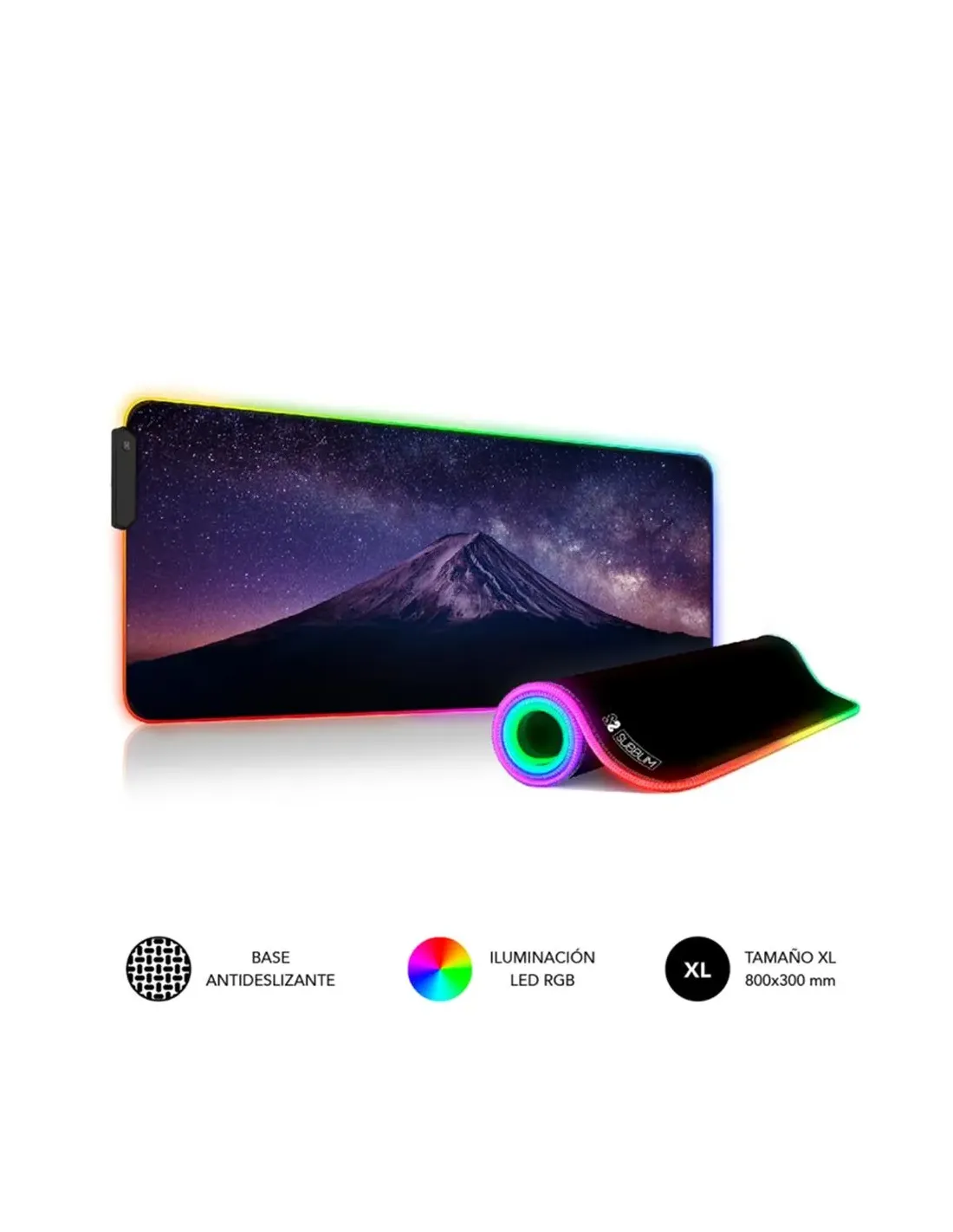 DestacadoVersión extra grande de 800x300x4 mm permite alojar el ratón y el teclado para un nivel de juego o trabajo constantes9 colores seleccionadles y 3 efectos de iluminaciónOfrece mucho espacio para juegos profesionales o trabajos de oficina que puedes complementar con diferentes accesoriosBordes cosidos duraderos para evitar que se deshilacheSuperficie optimizada para obtener un máximo rendimientoEl diseño de la Montaña creará un ambiente totalmente armonizado en tu escritorioSuperficie resistente al aguaFácil de limpiar con un paño húmedoAlta elasticidadBase antideslizante de goma que impide el deslizamiento involuntarioUnas inmensas dimensiones junto a la mejor experiencia de iluminación harán de la Alfombrilla LED RGB de Subblim, uno de tus accesorios indispensables para tus largas horas de entretenimiento opara un uso profesional. Relájate y encuentra el Zen que te proporciona la Montaña de este precioso diseño que sin duda crea un entorno de trabajo ideal.Múltiples Modos y Efectos de LucesLa alfombrilla de escritorio es un artículo que usas todos los días para trabajar o jugar. Combina funcionalidad y estética gracias a su cuidado diseño con bordes iluminados transparentes. Haz que brilletu escritorio gracias a la viva iluminación de esta alfombrilla. Podrás elegir entre 9 colores distintos y 3 efectos de iluminación.Tamaño Super GrandeProporciona espacio suficiente para utilizar tanto el ratón como el teclado de forma holgada, así como otros accesorios de uso cotidiano. Dispondrás de un mucho espacio para los juegos de estiloprofesional o para realizar tareas de diseño o comerciales, mientras proteges tu escritorio en todo momento.Fácil de UsarEs muy fácil de usar, tan solo tienes que conectarla y funcionará inmediatamente. Cambia de color mediante el botón de encendido y apagado. Esta alfombrilla de ratón está equipada con un puerto microUSB y con un cable extraíble.Superficie Ultra SuaveTejido de alta calidad tratado para asegurar un movimiento suave. Optimizado para un movimiento rápido, manteniendo una excelente velocidad y control durante el juego. Permite deslizar suavemente elratón.Tiene un revestimiento impermeable para evitar daños causados ??por bebidas derramadas u otros accidentes y permite una fácil limpieza con un paño húmedo.Base de Goma AntideslizanteBase de goma antideslizante que resiste el deslizamiento incluso durante el uso más intenso. Mejora la experiencia de trabajo e incrementa la comodidad. Proceso avanzado multi-capa gran flexibilidad yanti- curling para evitar desplazamientos de tu teclado o ratón.Peso y dimensionesAncho800 mmGrosor4 mmLongitud de cable1,2 mPeso532 gProfundidad300 mmDesempeñoAlfombrilla de ratón para juegosSiBordes contra enrollamientoSiBordes rematadosSiColor del productoNegro, MulticolorColor de luz de fondoMulticolorColoración de superficieImagenDiseño confortableSiEstructura reforzadaSiRetroiluminación LEDSiLavableSiMaterialTela, Neopreno, CauchoMaterial de la superficieTelaNúmero de modos de luz9TamañoXLUSB con suministro de corrienteSiEmpaquetadoAltura del paquete355 mmAncho del paquete95 mmCantidad por paquete1 pieza(s)Peso del paquete618 gProfundidad del paquete95 mmTipo de embalajeCajaSostenibilidadCertificados de sostenibilidadCE, RoHSCumplimiento de sostenibilidadSi