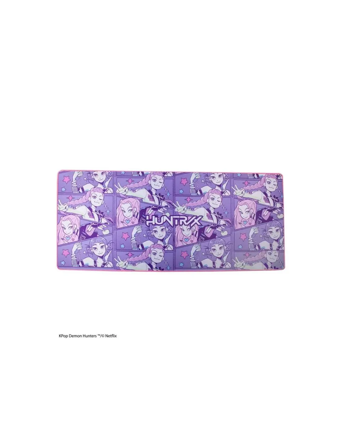 Características de la Alfombrilla de Escritorio XL KPop Demon Hunters HUNTR/XLa alfombrilla de escritorio XL KPop Demon Hunters HUNTR/X es el complemento perfecto para quienes buscan combinar rendimiento, comodidad y diseño exclusivo en su setup. Inspirada en el universo KPop Demon Hunters de Netflix, ofrece una superficie amplia y resistente ideal para gaming, estudio o trabajo diario, aportando personalidad a cualquier escritorio.Formato XL para máxima libertad de movimientoGracias a su tamaño extendido, esta alfombrilla cubre una gran parte del escritorio, permitiendo colocar teclado y ratón sobre la misma superficie. Esto se traduce en mayor estabilidad, mejor control y una experiencia más uniforme tanto en sesiones de juego como en tareas profesionales.Dimensiones: 80 x 35 x 0,3 cmFormato XL para teclado y ratónSuperficie continua y ampliaSuperficie micro-texturizada de alta precisiónSu acabado en tejido micro-texturizado está diseñado para ofrecer un deslizamiento suave y preciso del ratón, mejorando la respuesta tanto en movimientos rápidos como en ajustes detallados. Es compatible con sensores ópticos y láser, asegurando un control fiable en cualquier situación.Micro-texture fabric para mayor precisiónDeslizamiento suave y uniformeApta para ratones ópticos y láserBase de neopreno antideslizanteFabricada en neopreno, proporciona una base flexible y resistente que se adapta al escritorio y evita desplazamientos indeseados. Su grosor de 3 mm aporta una sensación cómoda al apoyar las muñecas, mejorando la ergonomía durante largas jornadas.Material: NeopreneGrosor: 0,3 cm (3 mm)Base estable y flexibleDiseño oficial KPop Demon HuntersCon ilustraciones inspiradas en KPop Demon Hunters HUNTR/X, esta alfombrilla no solo mejora tu rendimiento, sino que también aporta un estilo distintivo y llamativo a tu espacio. Ideal para fans de la serie y para quienes buscan un accesorio diferente y funcional.Licencia oficial KPop Demon Hunters ? © NetflixDiseño temático HUNTR/XEstética vibrante en tonos morados y rosados