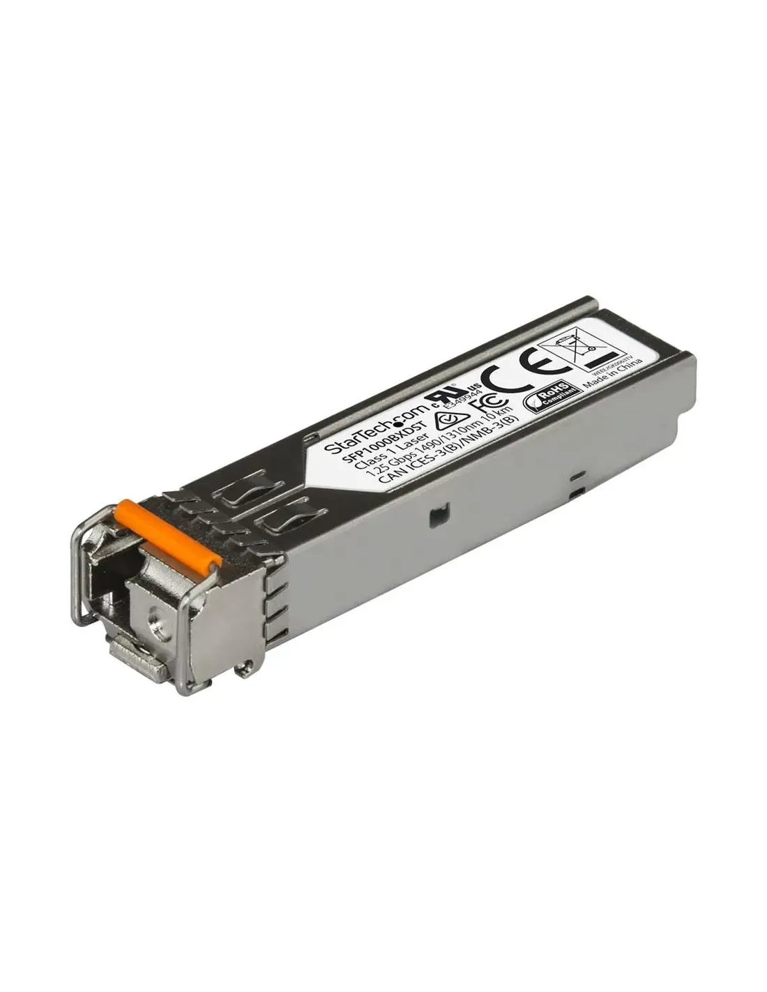 Características del StarTech.com MSA Uncoded SFP Module, 1000BASE-BXEl módulo transceptor SFP StarTech.com 1000BASE-BX está diseñado para ofrecer una conexión de fibra óptica de alta velocidad y larga distancia en redes de 1 Gigabit Ethernet. Ideal para implementaciones que requieren comunicación bidireccional (BiDi) sobre un solo hilo de fibra óptica, este módulo cumple con los estándares MSA y ofrece compatibilidad con aplicaciones profesionales y empresariales que demandan estabilidad, eficiencia y control de diagnósticos.Módulo SFP para conexión BiDi y alcance extendidoEste transceptor soporta la tecnología 1000BASE-BX para transmisiones bidireccionales a través de una sola fibra, facilitando la instalación y reduciendo costos en cableado. Con un alcance máximo de hasta 10 km, es perfecto para conexiones entre edificios o puntos de red distantes sin comprometer la velocidad ni la integridad de la señal.Velocidad de transferencia: 1 Gbps (Gigabit Ethernet)Alcance: hasta 10 kmConector: LC ópticoCompatibilidad y control avanzadoCompatible con los estándares IEEE 802.3z y MSA, este módulo está diseñado para integrarse fácilmente en redes con equipamiento variado. Cuenta con soporte para Control óptico digital (DOM) y Digital Diagnostics Monitoring (DDM), que permiten supervisar en tiempo real el estado y parámetros ópticos para una gestión más eficiente y segura de la conexión.Control óptico digital (DOM)Monitorización Digital Diagnostics (DDM)Cumplimiento de normativas: cUL, FCC, RoHS, WEEEDiseño compacto y resistencia ambientalCon un factor de forma compacto de módulo mini-GBIC SFP y un peso ligero de tan solo 30 gramos, el dispositivo se adapta a diferentes equipos sin afectar el espacio ni la refrigeración. Soporta un amplio rango de temperatura de operación de 0 °C a 70 °C y un nivel de humedad entre 5% y 95%, garantizando un rendimiento fiable en diversos entornos de trabajo.Dimensiones: 1.26 cm (alto) x 1.39 cm (ancho) x 5.84 cm (profundidad)Temperatura operativa: 0 °C a 70 °CHumedad relativa: 5% - 95%