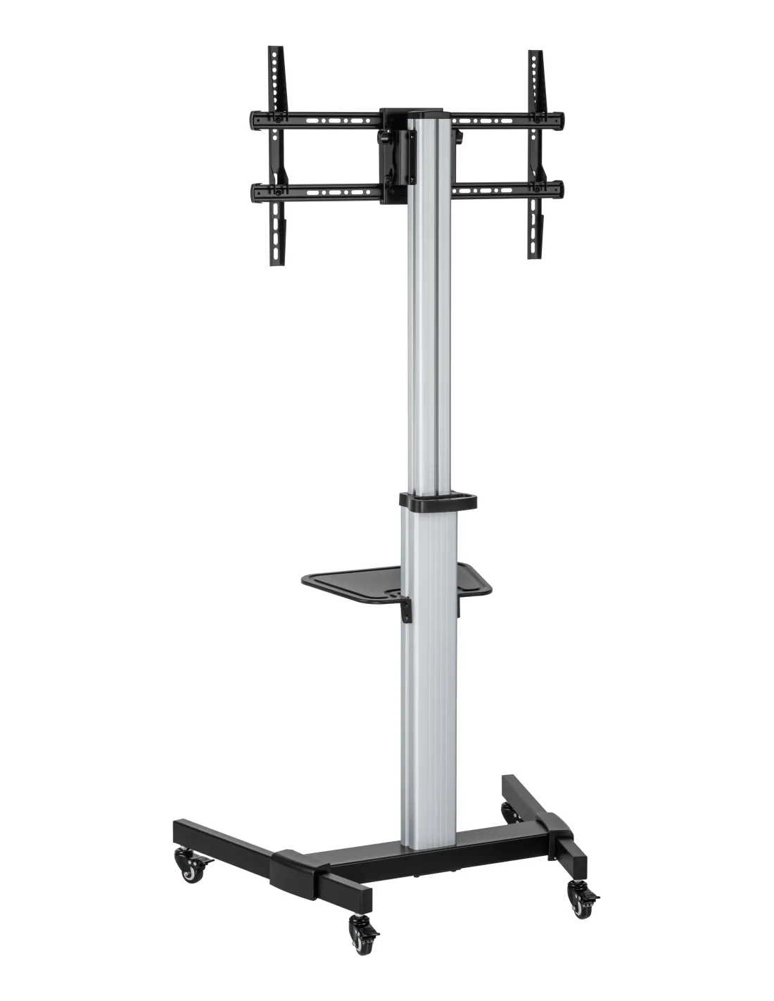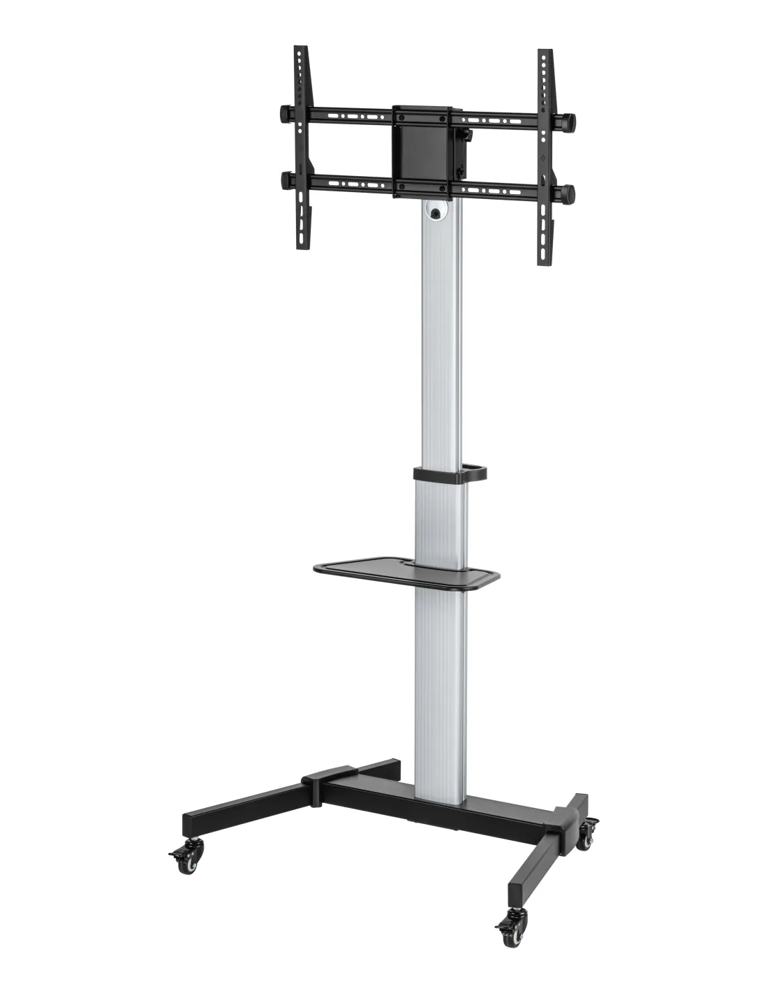 Incluye cuatro ruedas con freno y un asa tipo D para facilitar su transporte y asegurar una colocación estable. El ajuste de altura vertical proporciona una experiencia visual cómoda, mientras que la gestión de cables integrada mantiene todo limpio y ordenado, ideal para reuniones, presentaciones o ferias.