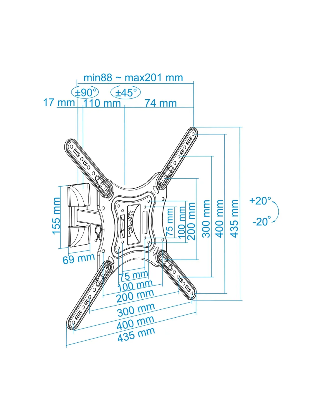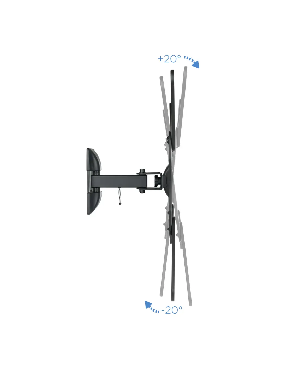 - Soporte metálico giratorio e inclinable para monitor / TV LCD, PLASMA y LED de 2 pivotes (23” – 55”)- VESA Máximo: 400x400mm / Compatible con los formatos de fijación de pantalla VESA 75x75mm,100x100mm, 200x100mm, 200x200mm, 400x200mm, 300x300mm y 400x400mm- Pantallas soportadas: 23” – 55”- Carga máxima: 30kg- Ángulo máximo de giro: 90º- Angulo de inclinación: -20º / +20º- Distancia de la pared: 88mm – 201mm- Incluye gancho recoge cables- Color negro