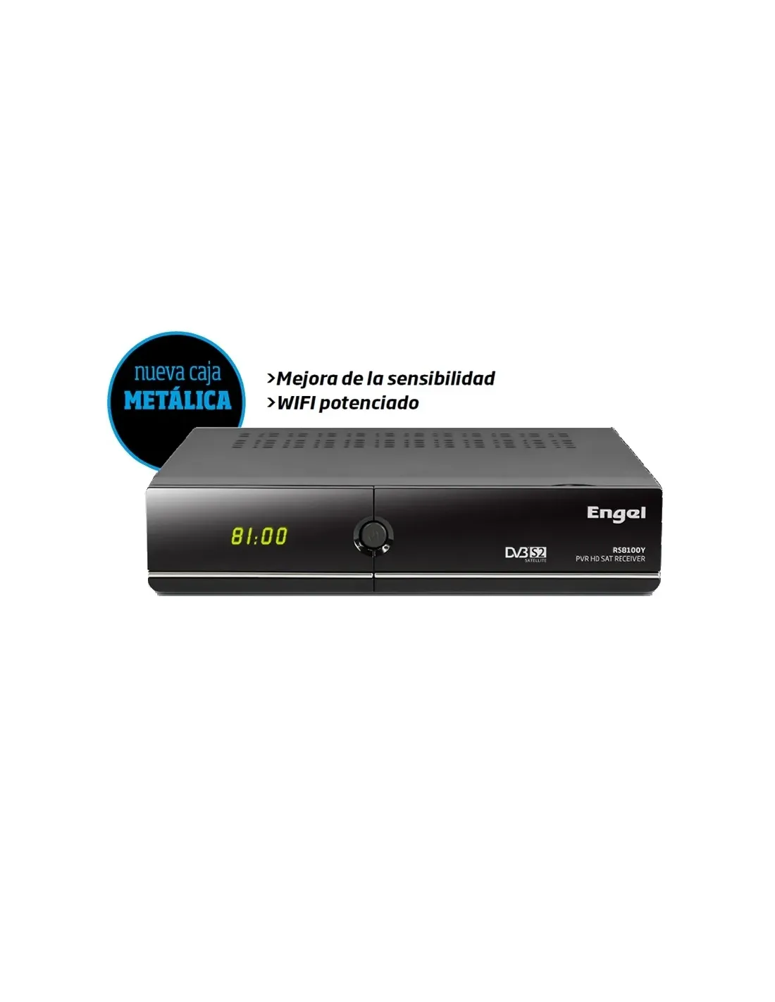 MarcaEngelModeloRS8100YCaracteristicas- Receptor Sátelite DVB-S2 de Alta Definición- Función IPTV- PVR (Personal Video Recorder) para reproducir y/o grabar en dispositivos externos (HDD, USB,...)- Función Timeshift (Pausa-Directo): pare un programa y continúe cuando quiera desde el punto de su interrupción- Puerto bidireccional USB 2.0- Reproduce música MP3, imágenes JPEG y vídeo- USB dongle WiFi- Lector de tarjetas CONAX- Conexión HDMI v.1.3, RCA, LNB IN & LOOP y salida de audio digital coaxial- Resoluciones: 1080p/i, 720p, 576p/i, 480p/i- Compatible con conmutadores DiSEqC 1.2 y USALS- Entrada Ethernet (V90 Mod.), 2x USB 2.0 y RS232- Guía Electrónica de Programas (EPG 7 días) y teletexto- Menús en pantalla y subtítulos multi-idioma- Actualización de software y canales vía RS232, USB, OTAContenido- Receptor Satélite.- Mando a distancia.- Antena wifi.- Cable HDMI.- Fuente de alimentación.- Manual de usuario.Fecha de revisión21-09-2018 por MSB