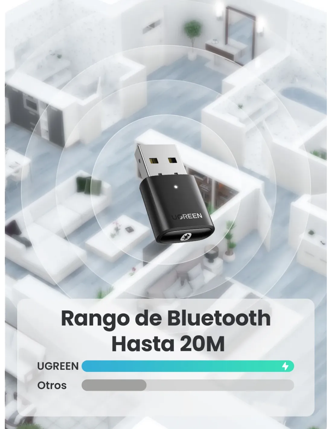 .Adaptador Bluetooth 5.0: aplica el último Bluetooth 5.0 + EDR + Bluetooth de bajo consumo, este adaptador USB Bluetooth para PC ha aumentado en gran medida la capacidad antiinterferencias y ha reducido la pérdida de eficiencia de transmisión causada por interferencias, lo que le permite estar lleno de imaginación con el audio..Función mejorada: con la tecnología más avanzada, este adaptador Bluetooth le otorgará hasta el doble de velocidad y cuatro veces la cobertura en comparación con Bluetooth 4.0, logrando la función de mayor velocidad de la señal de audio y mayor cobertura de la señal Bluetooth..Alcance increíble: con este adaptador Bluetooth, puede experimentar la libertad de la conectividad inalámbrica, lo que le permite disfrutar de audio de alta calidad al menos a 60 pies de distancia. No se preocupe más por la señal reducida y la señal inestable para una conexión prolongada de los dispositivos, el USB Bluetooth proporciona una conexión confiable y de largo alcance para las necesidades de su dispositivo inalámbrico..Amplia compatibilidad: el adaptador USB Bluetooth de UGREEN es compatible con Windows 11, 10, 8.1 y 7, y ofrece la función Bluetooth para auriculares, altavoces, teclados, ratones, mandos, impresoras, teléfonos móviles y mucho más..Tamaño mini: un diseño elegante y ultrapequeño significa que puedes insertar el adaptador USB Bluetooth en cualquier puerto USB sin bloquear los puertos USB circundantes y simplemente mantenerlo allí, sin importar cuando estés de viaje o en casa..Nota: 1. Este adaptador no se puede utilizar directamente en PS3, PS4, PS5, Switch o Xbox Console. 2. Este adaptador es un adaptador Bluetooth para PC y se puede emparejar con dispositivos Bluetooth, pero no funciona con dispositivos inalámbricos.