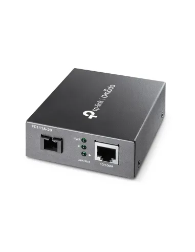 TP-Link Omada FC111A-20. Rango máximo de transferencia de datos: 100 Mbit/s, Estándares de red: IEEE 802.3, IEEE 802.3i, IEEE 802.3u, Ethernet LAN, velocidad de transferencia de datos: 10,100 Mbit/s. Distancia de transferencia máxima: 20000 m, Estructura de modo de fibra: Monomodo, Diámetros de fibra de cable soportado: 9/125 µm. Indicadores LED: Actividad, Enlace, Poder, Color del producto: Negro. Conector fibra óptica: SC, Tecnología de conectividad: Alámbrico. Voltaje de salida: 5 V, Corriente de salida: 0,6 A