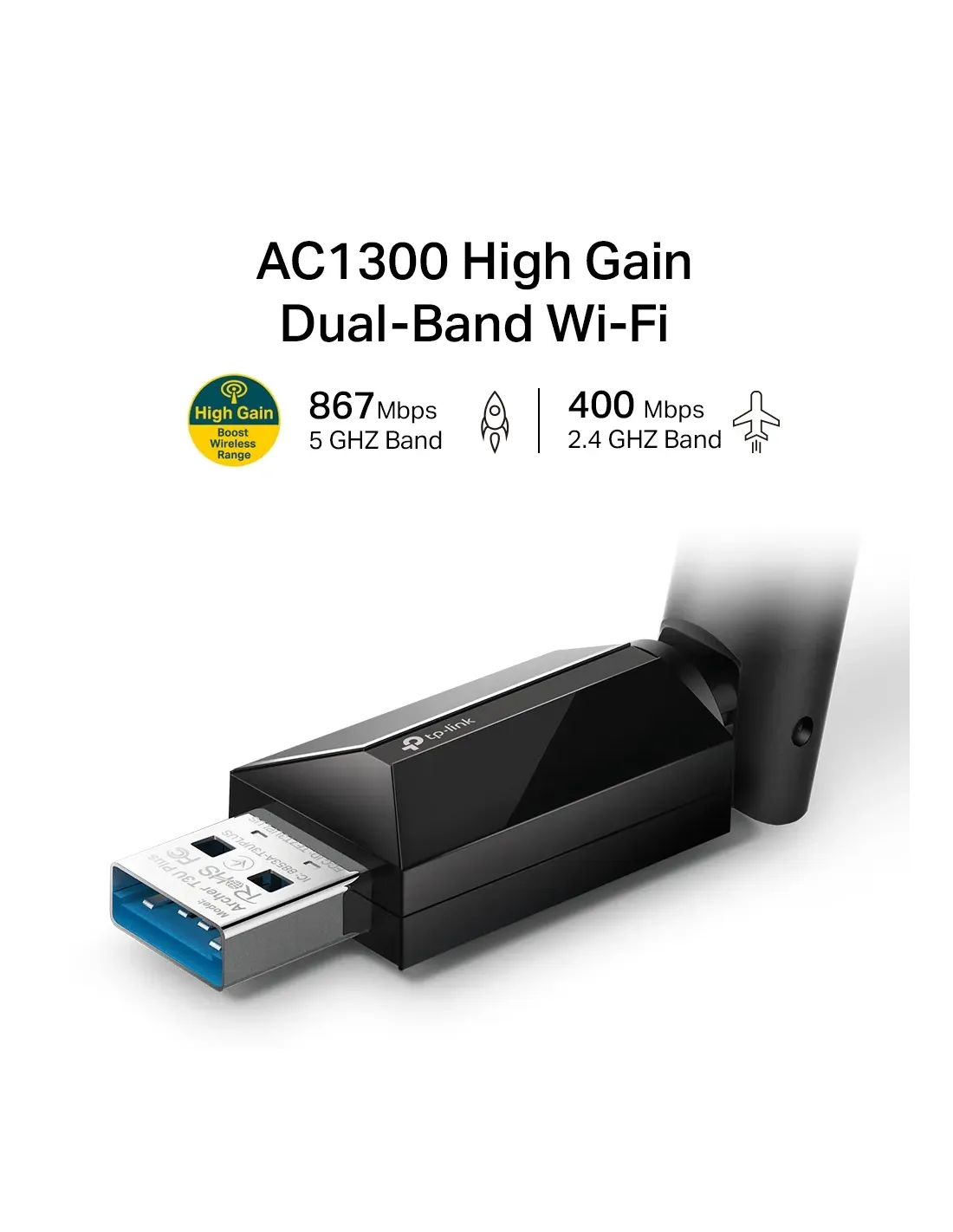 TP-LINK ARCHER T3U PLUS AC1300 HIGH GAIN WI-FI DUAL BAND USB ADAPTER, 867MBPS AT 5GHZ + 400MBPS AT 2.4GHZ, USB 3.0, 1XHIGH GAIN EXTERNAL ANTENNA, MU-MIMO