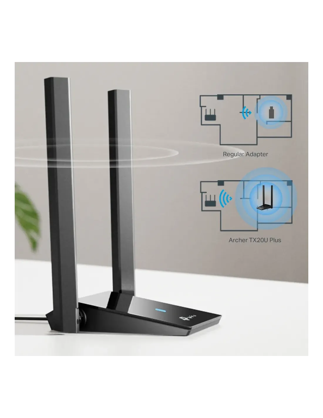 TP-Link Archer TX20U Plus. Rango máximo de transferencia de datos: 1800 Mbit/s, Velocidad máxima de transferencia de datos (2,4 GHz): 574 Mbit/s, Velocidad máxima de transferencia de datos (5 GHz): 1201 Mbit/s. Algoritmos de seguridad soportados: WEP, WPA, WPA-PSK, WPA2, WPA2-PSK, WPA3. Conector USB: USB tipo A. Ubicación: Mesa, Color del producto: Negro, Indicadores LED: Estado. Tipo de antena: Externo, Tipo de dirección de la antena: Direccional