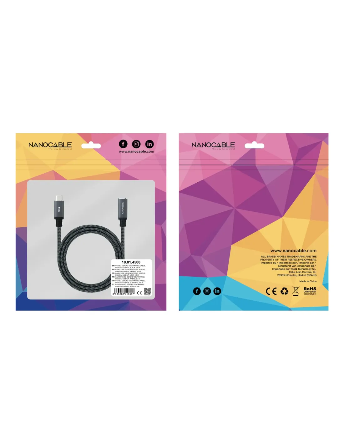 Marca Nanocable Modelo 10.01.4501-COMB Características - Cable prolongador USB-C macho a hembra - El cable ofrece hasta 5 amperios 100W de carga. - Velocidad de transferencia de datos de hasta 20Gbps. - Compatible con vídeo hasta 4k a 60Hz. - Compatible con puertos con Thunderbolt™ 3. - Certificación USB-IF - Cable mallado de algodón. - Longitud: 1 metro Dimensiones y peso - 135 x 180 x 15 mm - 0,045 Kg Fecha de revisión 26-05-2025 por DR