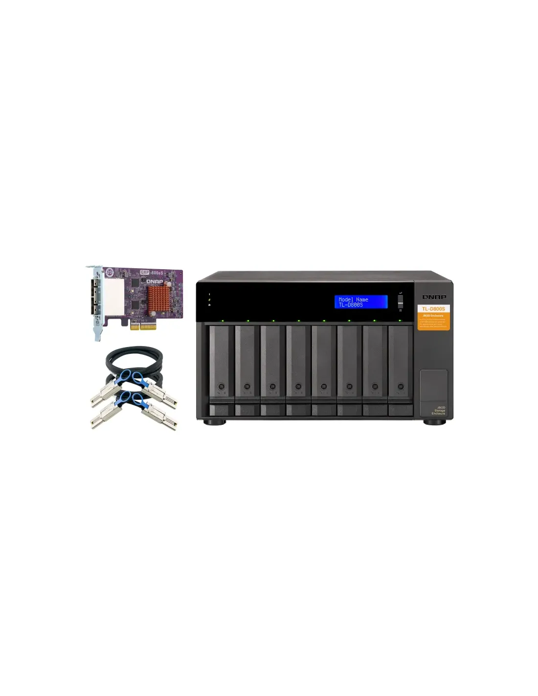 La caja de almacenamiento JBOD TL-D800S le permite hacer copia de seguridad y expandir tanto unidades NAS de QNAP como ordenadores y servidores Windows y Ubuntu. El TL-D800S incluye ocho bahías para unidades SATA 6Gb/s de 3,5 pulgadas y cuenta con una tarjeta QXP PCIe para conectar la caja utilizando un cable SFF-8088 (o SFF-8644). Ofrece un rendimiento de lectura/escritura fiable para optimizar las tareas de almacenamiento y copia de seguridad