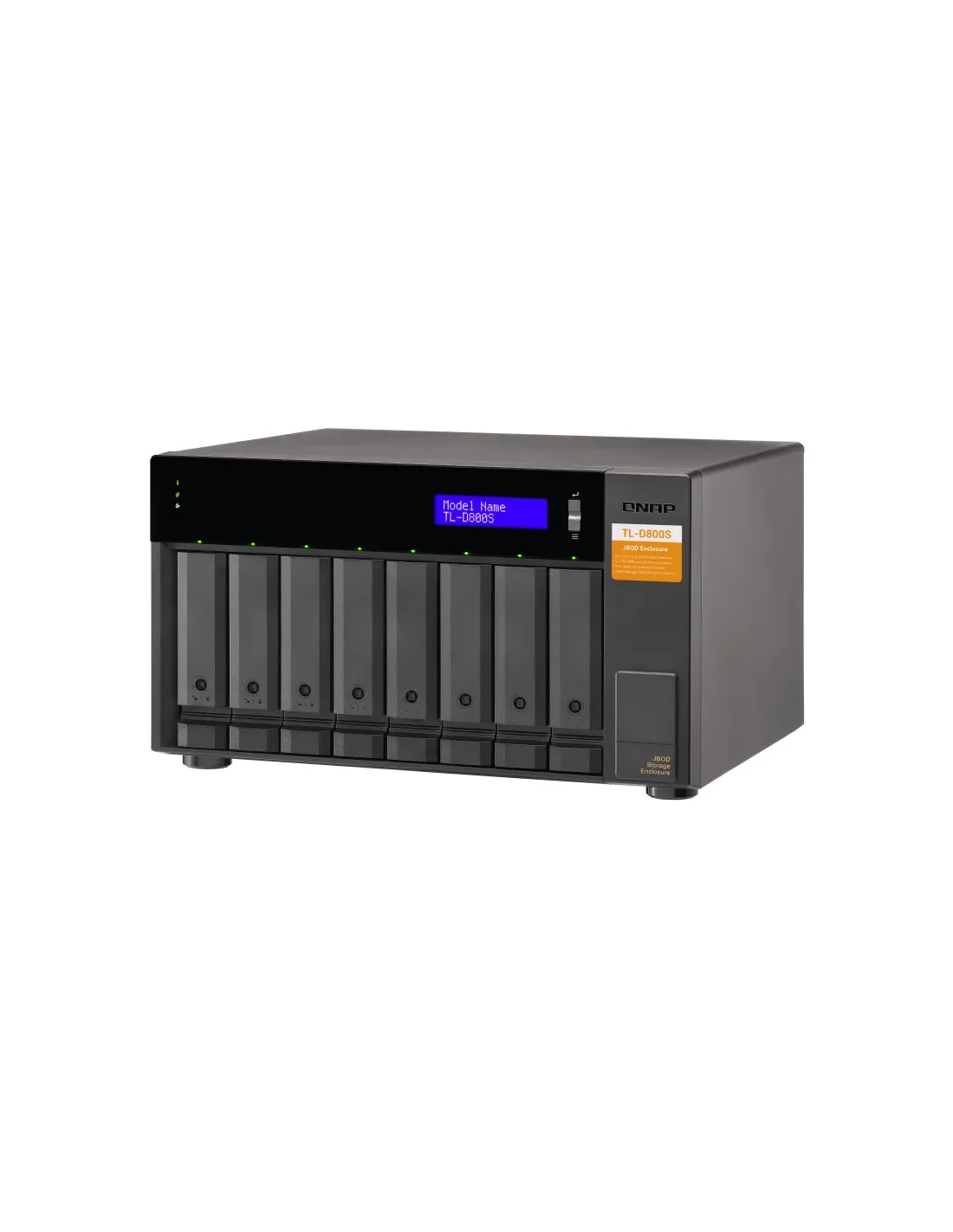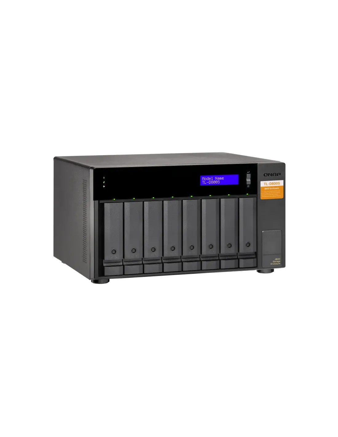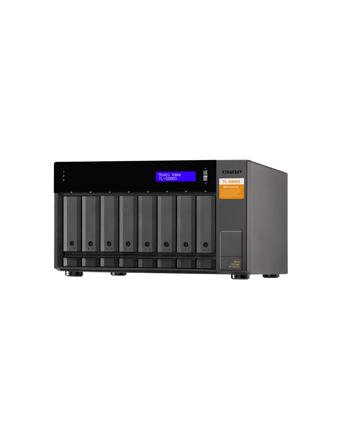 QNAP TL-D800S. Tipo de producto: Carcasa de disco duro/SSD. Número de unidades de almacenamiento compatibles: 8, Tamaño de la unidad de almacenamiento: 2.5/3.5", Interfaces de disco de almacenamiento soportados: Serial ATA II, Serial ATA III. Velocidad de transferencia de datos: 6 Gbit/s. Hot-swap. Tipo de visualizador: LCD, Color del producto: Negro, Gris