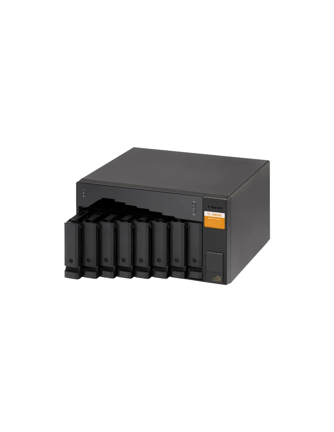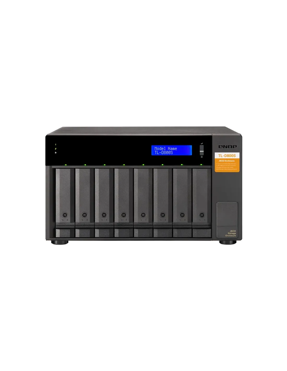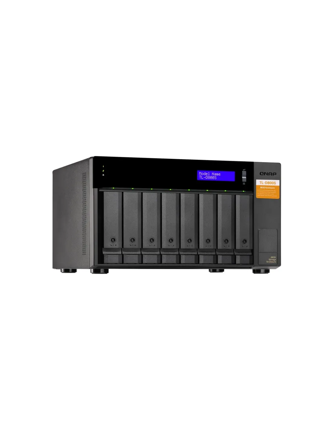 QNAP TL-D800S. Tipo de producto: Carcasa de disco duro/SSD. Número de unidades de almacenamiento compatibles: 8, Tamaño de la unidad de almacenamiento: 2.5/3.5", Interfaces de disco de almacenamiento soportados: Serial ATA II, Serial ATA III. Velocidad de transferencia de datos: 6 Gbit/s. Hot-swap. Tipo de visualizador: LCD, Color del producto: Negro, Gris