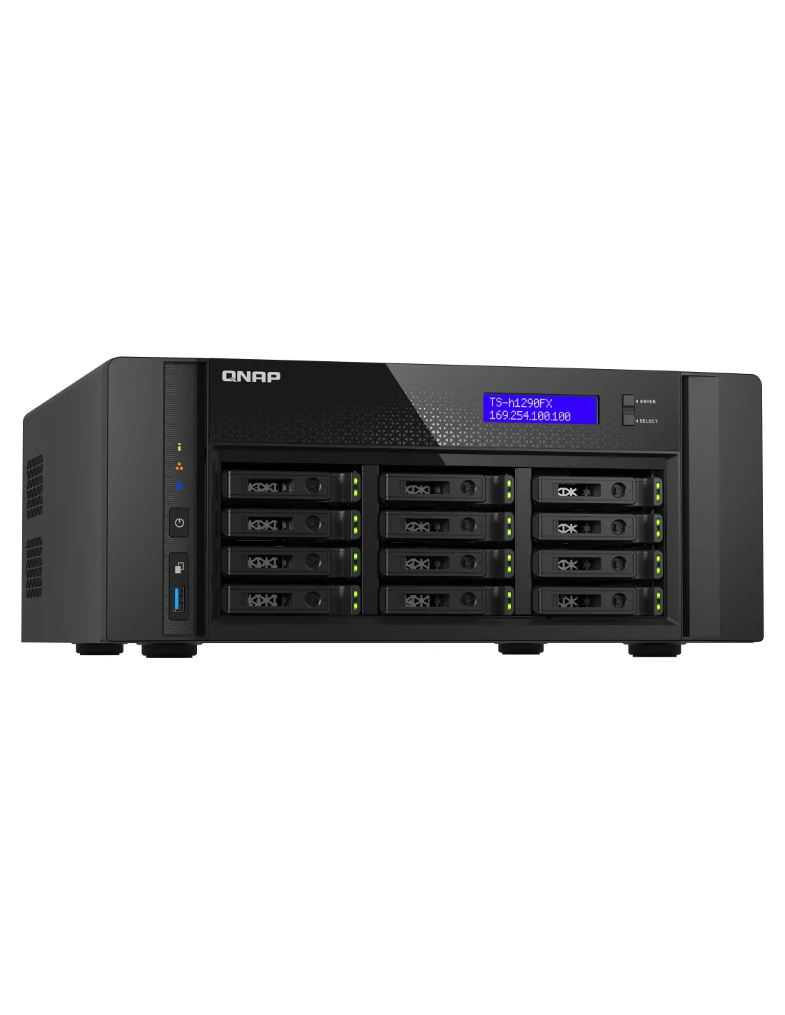 QNAP TS-h1290FX. Tipo: NAS. Tipo de chasis: Torre. Clase del dispositivo: Pequeñas y medianas empresas. Familia de procesador: EPYC, Modelo del procesador: 7302P, Frecuencia del procesador: 3 GHz. Memoria interna: 128 GB, Tipo de memoria interna: DDR4. Capacidad de almacenamiento total instalado: 0 TB. Sistema operativo instalado: QuTS hero