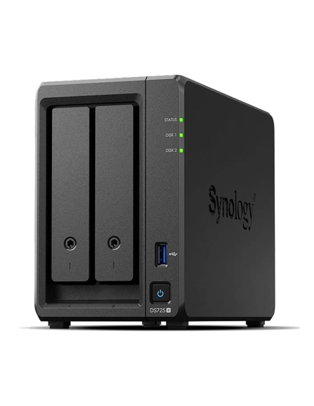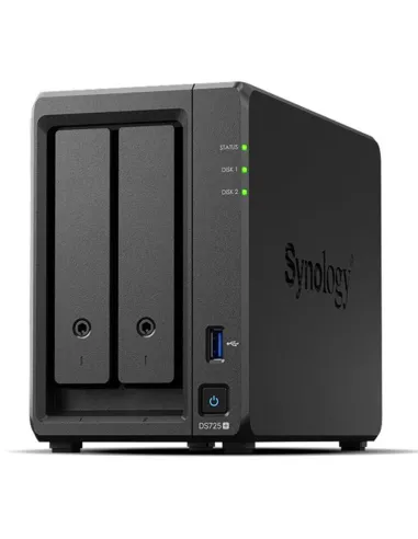 Este NAS cuenta con 2 bahías intercambiables en caliente compatibles con discos duros de 2.5"/3.5", con una capacidad máxima de hasta 200 TB. Además, dispone de 2 ranuras M.2 2280 NVMe para añadir caché SSD, mejorando el rendimiento global del sistema sin ocupar bahías principales. Gracias a su compatibilidad con múltiples configuraciones RAID, el DS725+ se adapta a diferentes necesidades de seguridad y velocidad.