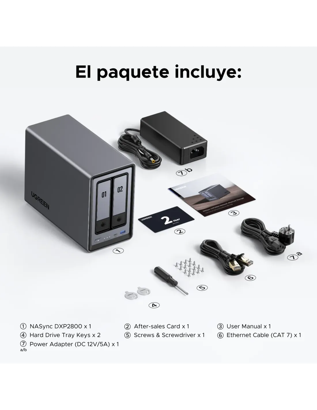 Ugreen NASync DXP2800 NAS System 2-Bay. Tipo: NAS. Tipo de chasis: Compacto. Clase del dispositivo: Usuarios domésticos. Familia de procesador: Intel® N, Modelo del procesador: N100. Memoria interna: 8 GB, Tipo de memoria interna: DDR5. Capacidad de almacenamiento total instalado: 0 TB. Sistema operativo instalado: UGOS Pro