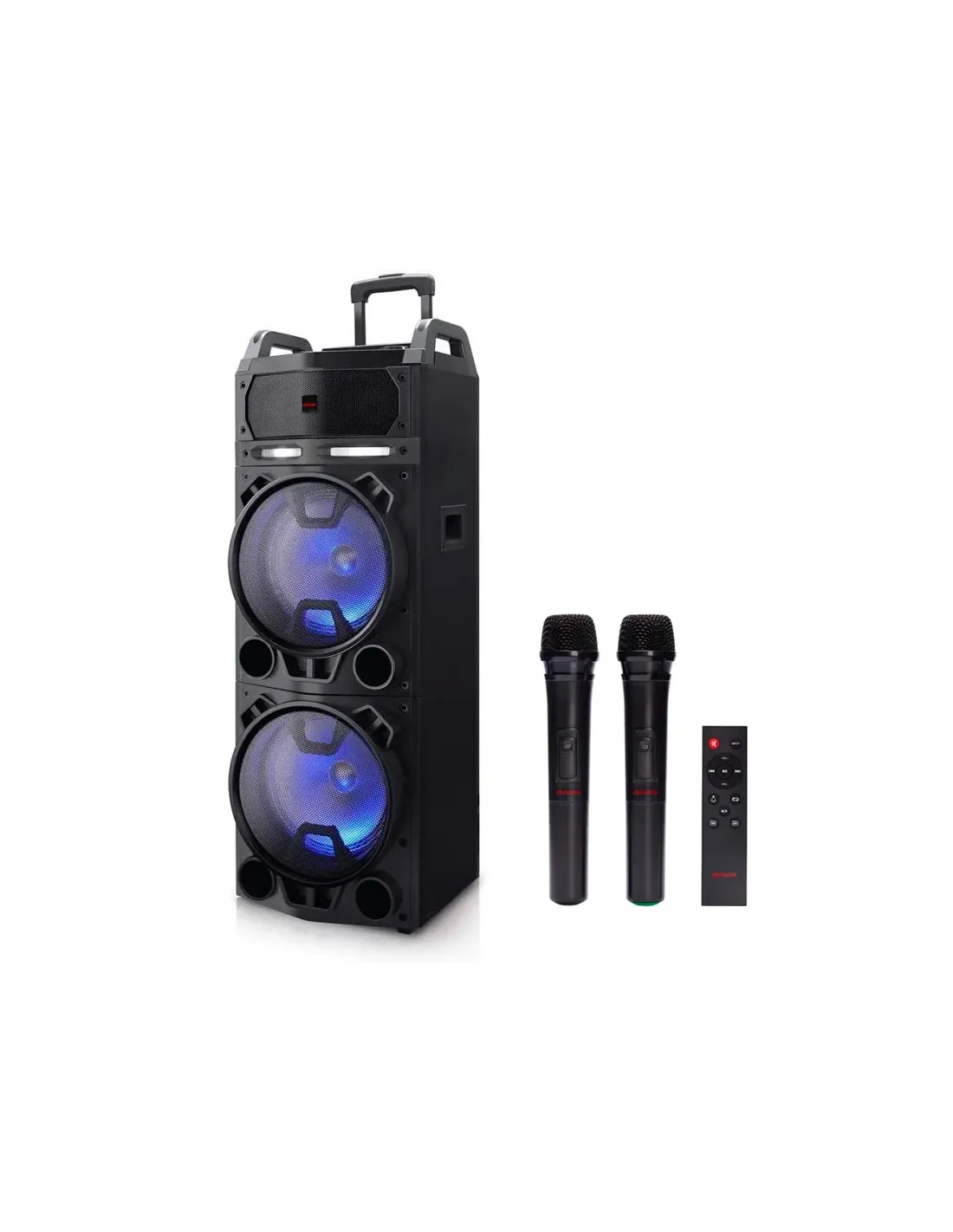 AIWA KBTUS-900 es un potentísimo altavoz trolley con conexión Bluetooth, 2micrófonos inalámbricos y mando a distancia.CaracterísticasEL TERREMOTO ROMPE EL CLUB Sienta el ritmo en sus huesos.INGENIERIA JAPONESA Diseño y sonido para sentir la fiestaMUCHAS FUNCIONES PARA DISFRUTAR Toca tu instrumento, canta y baila conEarthquakeCompatible Apto para todos los dispositivos.PMPO de 800 W Poder maximoLector de tarjetas TF ¡Reproduce tu música desde tu tarjeta TF y disfruta!Bluetooth Bluetooth 4.2Batería recargable 8 horas de juego.Radio FM Radio FM digitalSalida de audio Conectar audio con otros altavocesENTRADA AUX Escuche su música desde otros dispositivosUSB Escuche su MP3 desde su USBEspecificacionesEspecificaciones generalesCarretilla portátil AltavozAsa y ruedas para facilitar su transporteRadio FMEspectáculo de luces LED (encender / apagar)Función de karaokeFuente de alimentaciónEntrada: AC100-240V 50/60 HzDC 15V Conector de entrada para adaptador externo AC 230V (incluido)Batería: 12V 7000mAhTiempo de reproducción: 5-8 horasTiempo de carga: 6-10 horasEspecificaciones de audioAltavoz de 3 vías: 12 ? x2 + 4 ? + 1 ?Potencia de salida 800W100W RMSGraves: + 3DB / -5.5DB, 4 OHM / 60WAgudos: + 5DB / -10DB, 6 OHM / 10WRespuesta de frecuencia: 60Hz - 20KHzAudio S / N:>, 74dBEspecificaciones de conexiónBluetooth versión 4.2Alcance de funcionamiento de hasta 10 metrosUSB (máx. 32 GB)AUX INTarjeta TF (máx. 32 GB)Salida de audioEntrada de micrófono con cable Entrada de guitarraCaracterísticasEntrada de audio: se puede conectar con computadoras personales, teléfonosmóviles, DVD, VCD, CD, LD, TV, MP3, radio, piano electrónico y cualquier dispositivoque tenga salida de audio.Salida de audio: se puede conectar con otro altavoz que tenga entrada de audioVolumen de música automático reducido cuando la prioridad del micrófono estáen el modo de control de volumen del micrófonoControl de volumen de ecoControl de volumen y entrada de guitarraControl de volumen de graves y agudosEcualizador de 5 bandasSistema de karaoke con 2 micrófonos inalámbricos incluidosLED Pantalla Soporte integrado para teléfono / tabletaTamaño del producto: 40 cm de ancho x 120 cm de alto x 37 cm de profundidadPeso: 23,70 kg