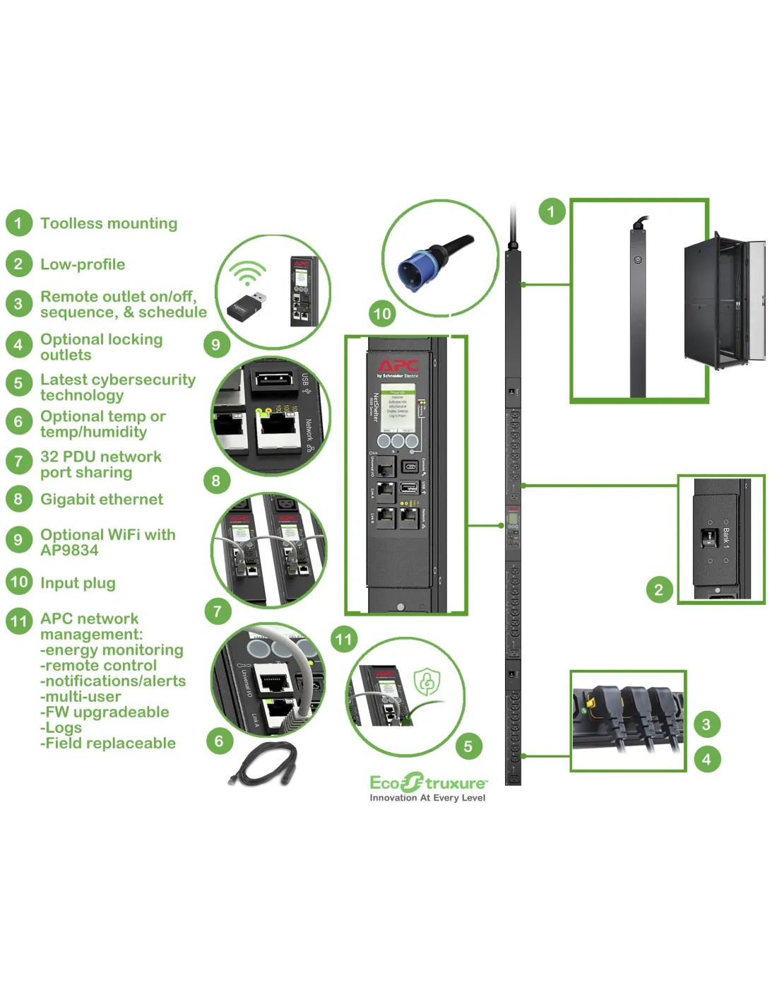 APC APDU9953. PDU tipos: Conmutado, Capacidad del rack: 0U, Tipo: Monofásico. Cantidad de salidas AC: 24 salidas AC, Tipo de salida AC: C13 acoplador, C19 acoplador, Conector: IEC 60309. Voltaje nominal de entrada: 200, 208, 230, 220-240 V, Máxima corriente: 32 A, Frecuencia de entrada AC: 50 - 60 Hz. Certificación: EAC, EN 55022 class A, EN 55024, EN 61000-3-2, EN 61000-3-3, RCM, VDE. Ancho: 56 mm, Profundidad: 46 mm, Altura: 1829 mm