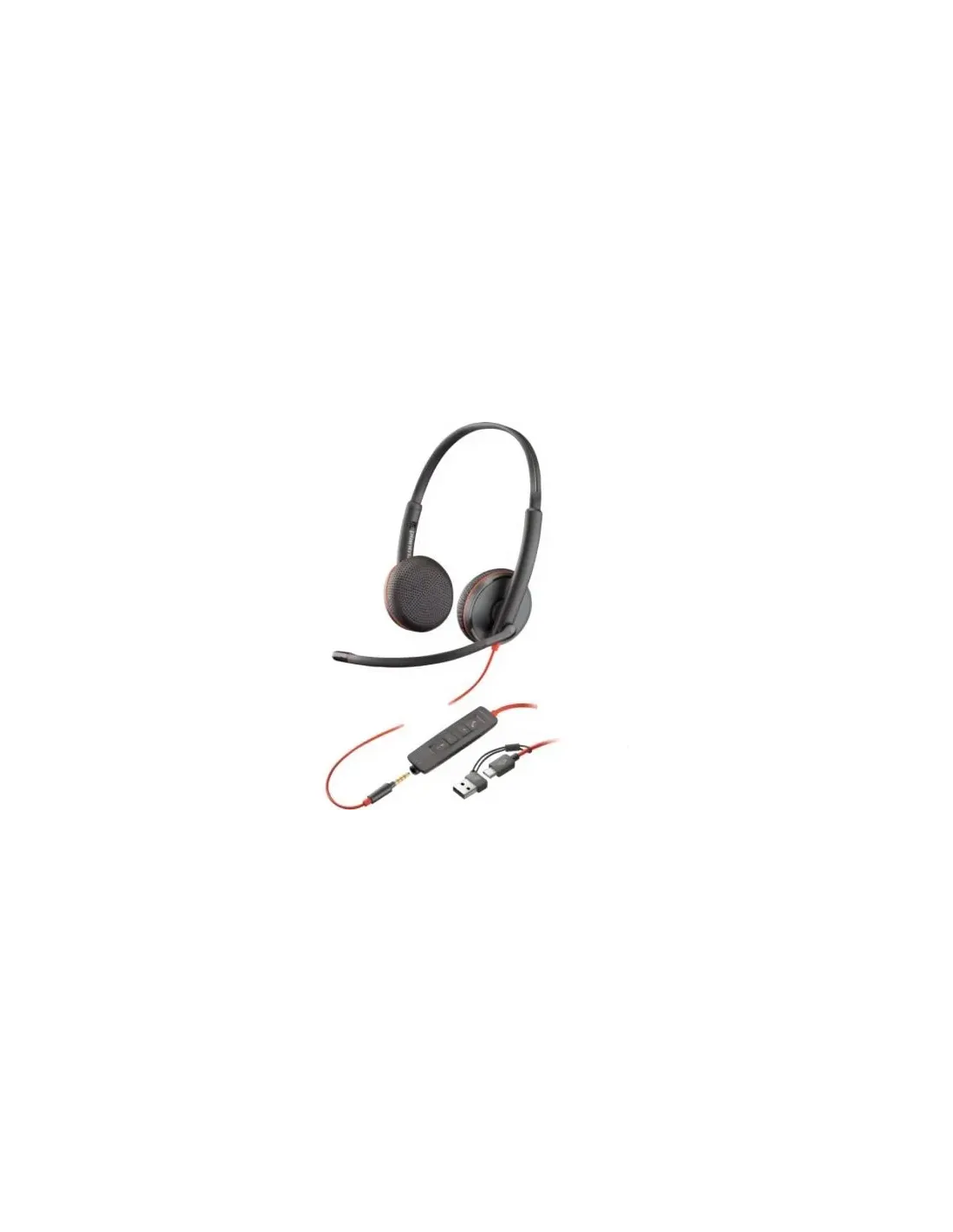 Características de los auriculares Poly Blackwire 3225 USB-CLos **Poly Blackwire 3225** son auriculares profesionales con cable diseñados para ofrecer una experiencia de comunicación clara, cómoda y versátil. Ideales para entornos de oficina, teletrabajo o videollamadas frecuentes, destacan por su diseño estéreo, conexión flexible mediante **USB-C y jack 3,5 mm**, y certificaciones para las principales plataformas de comunicación unificada. Su estructura ligera, junto con almohadillas en cuero artificial y brazo de micrófono ajustable, garantizan comodidad durante toda la jornada.Conectividad versátil y multiplataformaEstos auriculares se adaptan a distintos dispositivos gracias a su doble salida: **USB-C y conector de 3,5 mm**, e incluyen un adaptador USB-C a USB-A. Están certificados para funcionar sin problemas en plataformas como **Skype Empresarial, Cisco Jabber, Avaya y otros sistemas de UC**. Compatible con **Windows 10/11 y macOS**.Conectores: USB-C, minijack de 3,5 mm, adaptador a USB-A incluidoCompatibles con Mac y WindowsCertificados para Skype Empresarial, Cisco Jabber y AvayaAudio de alta calidad con cancelación de ruidoEquipados con tecnología de **procesamiento digital de señales** y **ecualizador dinámico optimizado**, ofrecen un sonido nítido tanto para voz como para contenido multimedia. El micrófono **boom omnidireccional con cancelación de ruido** mejora la claridad en llamadas incluso en entornos con distracciones.Respuesta de frecuencia del micrófono: 100 - 10000 HzRelación señal/ruido: 118 dBMicrófono ajustable y rotativo 270°Diseño cómodo para uso prolongadoGracias a su diseño ligero y ergonómico, los Poly Blackwire 3225 ofrecen una experiencia de uso prolongada sin molestias. Las **almohadillas de cuero artificial**, el peso reducido (92 g) y la posibilidad de ajustar el micrófono a la posición ideal, permiten un uso diario eficiente y confortable.Peso: 92 gAlmohadillas de cuero sintéticoIncluye bolsa de transporte para mayor protecciónControl al alcance de la manoLos controles integrados en el cable permiten **responder, ignorar, finalizar llamadas, silenciar, ajustar volumen o realizar rellamadas** con facilidad, optimizando la productividad sin apartar la vista del trabajo.Controles en el cable: responder/finalizar, volumen, mute, rellamadaLongitud del micrófono: 130 mmCable USB-C de conexión rápidaOtras especificacionesModo de salida de sonido: EstéreoImpedancia: 32 OhmDiámetro del diafragma: 28 mmDimensiones: 17.8 × 15.5 × 3.2 cmDimensiones con embalaje: 20.7 × 18.5 × 5.6 cm (peso: 242 g)Serie: Blackwire 3200 Series