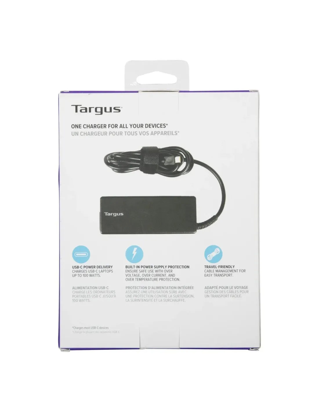 Visión generalDondequiera que te lleven tus viajes de negocios, ya sea a la oficina o alcliente, es esencial estar completamente cargado para el viaje. Llévate elcargador USB-C PD de 100 W de Targus y mantén tu portátil, tableta oteléfono USB-C cargado*.El adaptador de corriente admite hasta 100 W, potencia suficiente para lamayoría de los dispositivos portátiles de hasta 17 pulgadas**. El adaptadorde corriente utiliza la tecnología Power Delivery y se combina con losdiseños de protección de energía de Targus para garantizar una cargarápida y segura optimizando la corriente de carga en todo momento.Proporciona protección contra los daños inmediatos debidos a lasobrecorriente y el sobrecalentamiento, además de preservar la salud dela batería a largo plazo, prolongando la vida del dispositivo.Compacto y ligero, también evita que los cables se enreden y se guardende forma ordenada con la brida para cables incluida.* Carga la mayoría de los dispositivos USB-C PD** Puede variar según el dispositivo del portátilEspecificacionesColorNegroTipo de adaptadorMuroTipo actualACVatios100WDimensión19,2 x 5,3 x 17 cmPeso0,53 kgEAN5051794040005