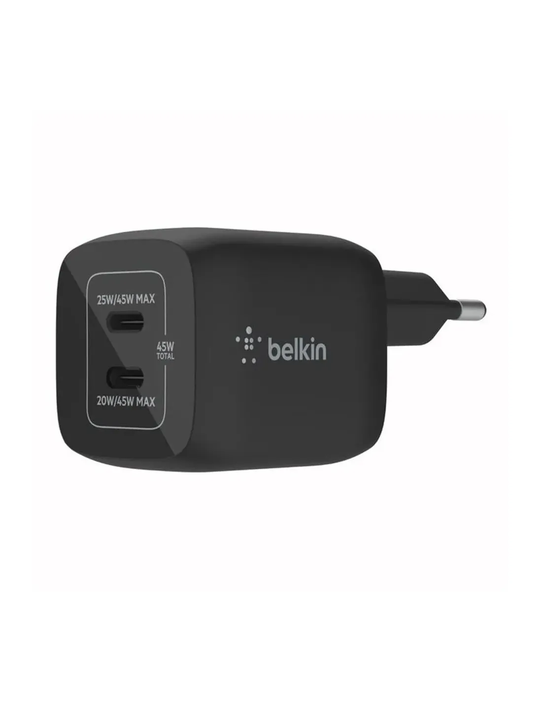 Características del Cargador USB-C Belkin 45W WCH011VFBK BoostCharge Pro NegroEl Belkin BoostCharge Pro de 45 W es un cargador compacto y eficiente, diseñado para ofrecer alimentación rápida y segura a tus dispositivos. Gracias a su tecnología GaN (nitruro de galio), proporciona más potencia en un tamaño reducido, ideal para uso diario en casa, en la oficina o durante viajes. Su diseño de 2 puertos USB-C lo hace perfecto para cargar de manera simultánea un móvil y una tablet o dos smartphones.Carga rápida con tecnología GaNEste cargador integra tecnología GaN, que permite mantener un rendimiento energético eficiente en un diseño más compacto y ligero. Además, incluye USB Power Delivery 3.0 con PPS, garantizando una carga más rápida y optimizada para cada dispositivo compatible.Potencia máxima: 45 WCompatibilidad con USB Power Delivery 3.0 y PPSDiseño compacto, fácil de transportarDoble puerto USB-C para mayor versatilidadCon sus 2 puertos USB-C, este cargador te permite conectar y alimentar dos dispositivos de forma simultánea, sin comprometer la velocidad de carga. Es ideal para quienes necesitan cargar el iPhone 14, iPhone 14 Plus, iPhone 14 Pro o iPhone 14 Pro Max, entre otros equipos compatibles.2 puertos USB-C de alta velocidadCarga simultánea de varios dispositivosCompatible con smartphones, tablets y otros dispositivos USB-CDiseño práctico y seguroEl cargador Belkin BoostCharge Pro está pensado para un uso universal y seguro. Su acabado en color negro ofrece un diseño discreto y elegante que encaja en cualquier entorno. Además, está optimizado para evitar sobrecalentamientos y proteger tus dispositivos durante la carga.Diseño elegante en color negroUso en interiores con conexión a corriente alternaSistemas de protección integradosOtras especificacionesTipo de cargador: InteriorCompatibilidad: UniversalAlimentación: Corriente alternaCantidad por paquete: 1 pieza