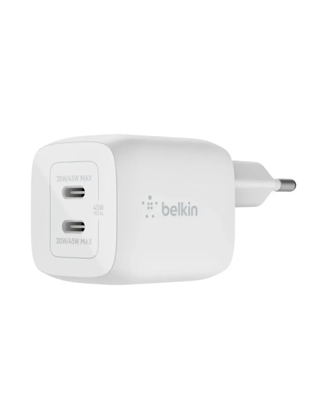 Características del Cargador USB-C Belkin 45W WCH011vfWH GaN Boost Charge ProEl **cargador Belkin Boost Charge Pro de 45W** está diseñado para ofrecer **energía rápida y segura** a portátiles, smartphones y tabletas. Gracias a la tecnología **GaN (nitruro de galio)**, este cargador combina **máxima eficiencia en un formato compacto**, ideal tanto para el hogar como para la oficina o viajes. Sus **dos puertos USB-C con Power Delivery 3.0 y PPS** permiten cargar varios dispositivos de manera simultánea sin comprometer la velocidad ni la seguridad.Tecnología GaN: potencia en un diseño compactoEl uso de transistores de **nitruro de galio (GaN)** mejora la gestión de energía, ofreciendo una **carga más rápida y eficiente** con un cargador más pequeño y ligero que los tradicionales. Perfecto para quienes buscan un accesorio de alto rendimiento sin sacrificar portabilidad.Diseño compacto y ligeroTecnología GaN para mayor eficienciaColor blanco elegante y versátilCompatibilidad versátil con carga rápidaEste cargador es compatible con **portátiles, smartphones y tabletas**, ofreciendo siempre la potencia adecuada gracias a su tecnología **USB Power Delivery 3.0 con PPS**. Permite recargar dispositivos de forma rápida, optimizando el tiempo de espera y cuidando la batería.Compatibilidad universal con dispositivos USB-CFunción de carga rápida integradaDistribución de potencia: hasta 25 W en el puerto 1 y 20 W en el puerto 2Seguridad y protección avanzadaEl cargador Belkin Boost Charge Pro está equipado con **sistemas de seguridad integrados** para proteger tanto al dispositivo como al usuario frente a situaciones de riesgo. Sus funciones de protección contra **sobrecarga y sobrecalentamiento** garantizan una carga fiable y sin preocupaciones.Protección contra sobrecalentamientoProtección contra sobrecargaDiseñado para un uso diario seguroOtras especificacionesTipo de cargador: InteriorAlimentación: Corriente alternaNúmero de puertos USB Tipo C: 2Potencia máxima: 45 WCantidad por paquete: 1 pieza
