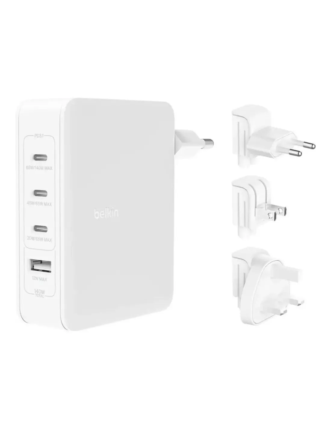 Características del Cargador USB-C Belkin BoostCharge Pro 140W WCH014btWHEl Belkin BoostCharge Pro 140W es un cargador de pared universal diseñado para ofrecer máxima potencia y versatilidad. Gracias a su tecnología GaN (nitruro de galio), combina un diseño compacto con una carga ultrarrápida y eficiente. Con 3 puertos USB-C y 1 puerto USB-A, es ideal para cargar de forma simultánea portátiles, tablets, smartphones y otros dispositivos electrónicos. Su potencia de hasta 140W con USB Power Delivery garantiza compatibilidad con equipos de alto consumo como MacBook Pro o ultrabooks de última generación.Potencia total de hasta 140WEste cargador incorpora tecnología USB Power Delivery (PD) para proporcionar la mejor carga posible a cada dispositivo conectado. Puedes alimentar un portátil de manera individual a máxima potencia o repartir energía entre varios aparatos.Potencia máxima: 140WPuerto USB-C 1: hasta 140WPuerto USB-C 2: hasta 65WPuerto USB-C 3: hasta 65WPuerto USB-A: hasta 12W (USB 3.2 Gen 1)Tecnología GaN para mayor eficienciaGracias a sus transistores GaN, el cargador ofrece una carga más eficiente y con menor generación de calor. Esto permite un diseño más compacto sin renunciar a la potencia, ideal para llevar en viajes o usar en la oficina sin ocupar espacio extra.Diseño compacto y ligeroAlta eficiencia energéticaMenor temperatura de funcionamientoVersatilidad y compatibilidad universalEl Belkin BoostCharge Pro está pensado para usuarios que necesitan cargar varios dispositivos a la vez. Su compatibilidad universal lo convierte en un accesorio imprescindible tanto para profesionales como para uso doméstico.Compatible con portátiles, smartphones, tablets y periféricosCarga simultánea de hasta 4 dispositivosColor blanco elegante y minimalistaOtras especificacionesTipo de cargador: InteriorAlimentación: Corriente alternaSuministro de potencia USB: SíCantidad por paquete: 1 pieza