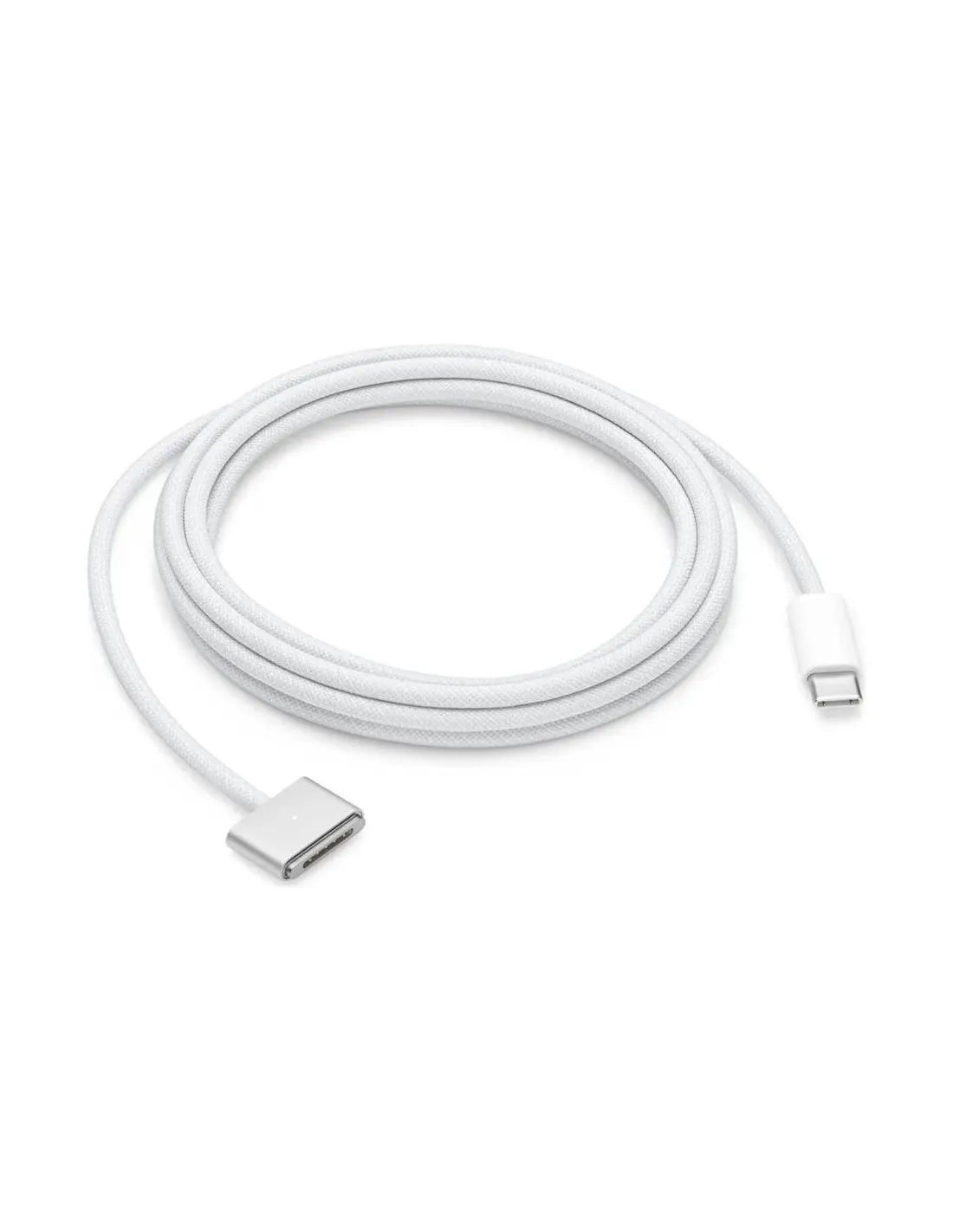Características del Cable de Alimentación Apple USB-C a MagSafe 3 (2 m)El **cable de alimentación Apple USB-C a MagSafe 3** de 2 metros está diseñado para ofrecer una conexión de carga rápida, segura y eficiente entre tu MacBook con puerto USB-C y un adaptador de corriente compatible. Con su diseño tejido resistente y su conector magnético MagSafe 3, este cable no solo garantiza durabilidad, sino también una conexión fácil y segura que se desconecta si alguien tropieza con él, evitando daños accidentales.Conexión segura y eficiente con MagSafe 3El conector **MagSafe 3** incorpora tecnología magnética para facilitar una conexión rápida y precisa. Esta tecnología protege tu dispositivo al desconectarse automáticamente si se tira del cable, y a la vez mantiene una carga estable durante el uso.Conexión magnética MagSafe 3Compatible con cargadores USB-C de alta potenciaIndicador LED de estado de carga integradoDiseño resistente y pensado para el día a díaEl cable está fabricado con un revestimiento **trenzado de alta resistencia** que mejora su durabilidad y reduce el riesgo de enredos o daños por uso prolongado. Su longitud de 2 metros ofrece libertad de movimiento mientras cargas tu MacBook en casa, en la oficina o de viaje.Revestimiento tejido para mayor durabilidadLongitud de 2 metros: mayor alcance y comodidadAcabado en color plata, a juego con tu MacCompatibilidad y garantía AppleFunciona con portátiles Apple equipados con **puerto MagSafe 3** y **adaptadores de corriente USB-C** de la marca. Incluye un año de garantía oficial de Apple para mayor tranquilidad.Conector USB-C (24 pines) macho en un extremoConector MagSafe 3 macho en el otro extremo1 año de garantía oficialOtras especificacionesTipo: Cable de alimentaciónAdmite carga rápidaIndicador LED de estado