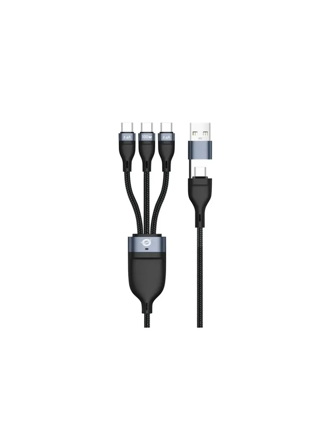 Características del Cable Conceptronic ETTA06B15C USB-A/USB-C a 3xUSB-C 100W 1,5 mEl cable **Conceptronic ETTA06B15C** es una solución versátil y eficiente para cargar y conectar múltiples dispositivos USB-C desde una sola fuente USB-A o USB-C. Diseñado para ofrecer **carga rápida de hasta 100 W**, este cable es ideal tanto para uso doméstico como profesional, permitiendo alimentar o sincronizar portátiles, tablets, smartphones y otros accesorios compatibles.Conectividad triple USB-C con carga rápida de 100 WEste cable cuenta con un diseño 3 en 1 que permite conectar simultáneamente hasta tres dispositivos USB-C, aprovechando su capacidad de **entrega de energía (USB Power Delivery)** de hasta **100 W (20 V / 5 A)**. Perfecto para cargar rápidamente dispositivos exigentes o mantener operativos varios periféricos desde un solo punto de conexión.Entrada: USB-A o USB-C machoSalidas: 3 x USB-C machoSoporta carga rápida PD de hasta 100 WDiseño funcional y materiales duraderosFabricado con **conductor de cobre** y un formato de cable redondo, este modelo garantiza una transmisión estable y una larga durabilidad. Su diseño Plug and Play facilita el uso sin necesidad de drivers ni configuraciones adicionales.Material del conductor: CobreTipo de cable: Redondo, flexible y resistenteDiseño de conectores: Rectos, macho a machoTransferencia de datos y compatibilidadAunque su enfoque principal es la carga, el cable también permite **transferencia de datos** a una velocidad de hasta **480 Mbps** (USB 2.0), adecuada para sincronizar documentos, fotos o archivos entre dispositivos compatibles.Versión USB: 2.0Tasa de transferencia: hasta 0,48 Gbit/sCompatible con equipos y accesorios USB-CDimensiones compactas y certificacionesCon una longitud de 1,5 metros y un peso ligero, el ETTA06B15C es **fácil de transportar** y se adapta a cualquier entorno de trabajo o movilidad. Además, cumple con los principales estándares de seguridad y medioambiente.Longitud del cable: 1,5 mPeso: 80 gCertificaciones: CE, RoHS, REACHOtras especificacionesVoltaje de salida: 20 VCorriente de salida máxima: 5 AColor: NegroConectar y usar (Plug and Play): SíTipo de embalaje: Caja (1 unidad)