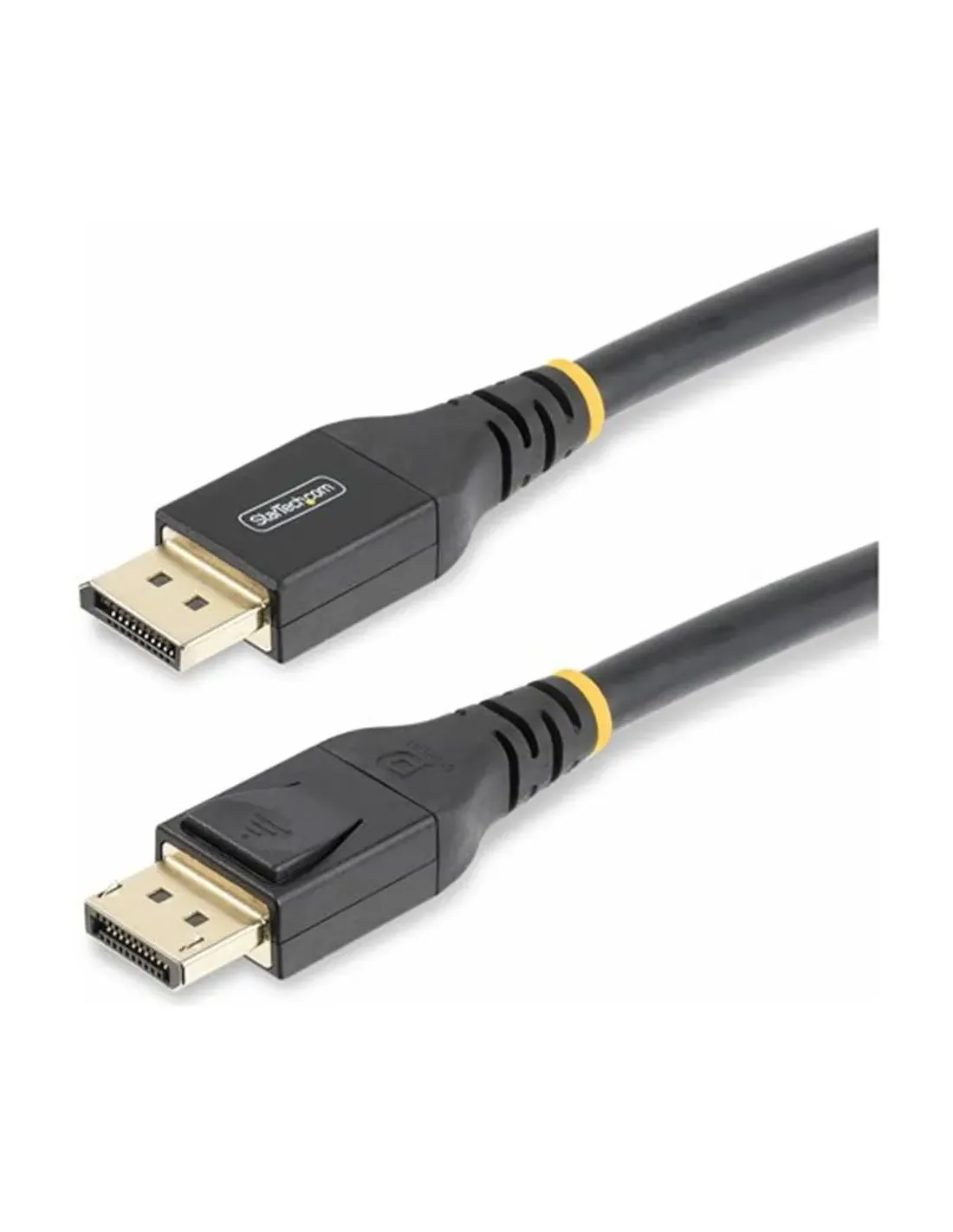 Características del StarTech.com Cable de 15m DisplayPort 1.4 Certificación VESAEl cable DisplayPort 1.4 de 15 metros de StarTech.com está diseñado para ofrecer conexiones de alta calidad en largas distancias, siendo ideal para entornos profesionales, configuraciones multimedia avanzadas o setups que requieren mayor alcance sin perder rendimiento. Gracias a su tecnología activa y compatibilidad con resoluciones de hasta 8K, garantiza una transmisión de señal estable y sin interferencias.Resolución 4K y 8K con alto rendimientoEste cable soporta resoluciones 4K y 8K, permitiendo disfrutar de contenido con máxima nitidez y fluidez. Su elevada capacidad de ancho de banda asegura una experiencia visual sin cortes, incluso en aplicaciones exigentes como edición de vídeo, gaming o entornos profesionales.Compatibilidad con resoluciones 4K y 8KAncho de banda de hasta 32,4 GbpsTasa de transferencia de hasta 25,92 GbpsCompatible con tecnologías como DSC 1.2 y HDCP 2.2Tecnología activa para largas distanciasGracias a su diseño de cable activo de cobre, este modelo mantiene la integridad de la señal en los 15 metros de longitud, evitando pérdidas de calidad habituales en cables largos. Es perfecto para instalaciones en oficinas, salas de reuniones o entornos audiovisuales.Longitud de 15 metrosAdaptador activo integradoSeñal estable en largas distanciasMulti-Stream Transport (MST)Construcción robusta y seguraFabricado con materiales de alta calidad, este cable ofrece durabilidad y protección frente a interferencias. Su blindaje avanzado y revestimiento flexible garantizan un uso prolongado y seguro incluso en instalaciones exigentes.Conectores chapados en oroBlindaje con lámina de aluminio y trenzadoRevestimiento de elastómero termoplástico (TPE)Libre de halógenos y con alivio de tensiónConectividad universal y compatibilidad garantizadaEl cable cuenta con conectores DisplayPort macho en ambos extremos, ofreciendo compatibilidad con una amplia gama de dispositivos como monitores, tarjetas gráficas y estaciones de trabajo. Además, cumple con los principales estándares del sector para asegurar un funcionamiento fiable.Conector DisplayPort de 20 pines (macho) en ambos extremosCompatible con DisplayPort 1.4Cumple normativas RoHS, WEEE y VW-1Retrocompatible con versiones anterioresOtras especificacionesColor: NegroDiámetro exterior: 7.5 mmCalibre: 24/28 AWGCompatibilidad con hasta 32 canales de audio digital sin comprimirDimensiones del embalaje: 46 x 35 x 15 cmPeso del embalaje: 1 kg