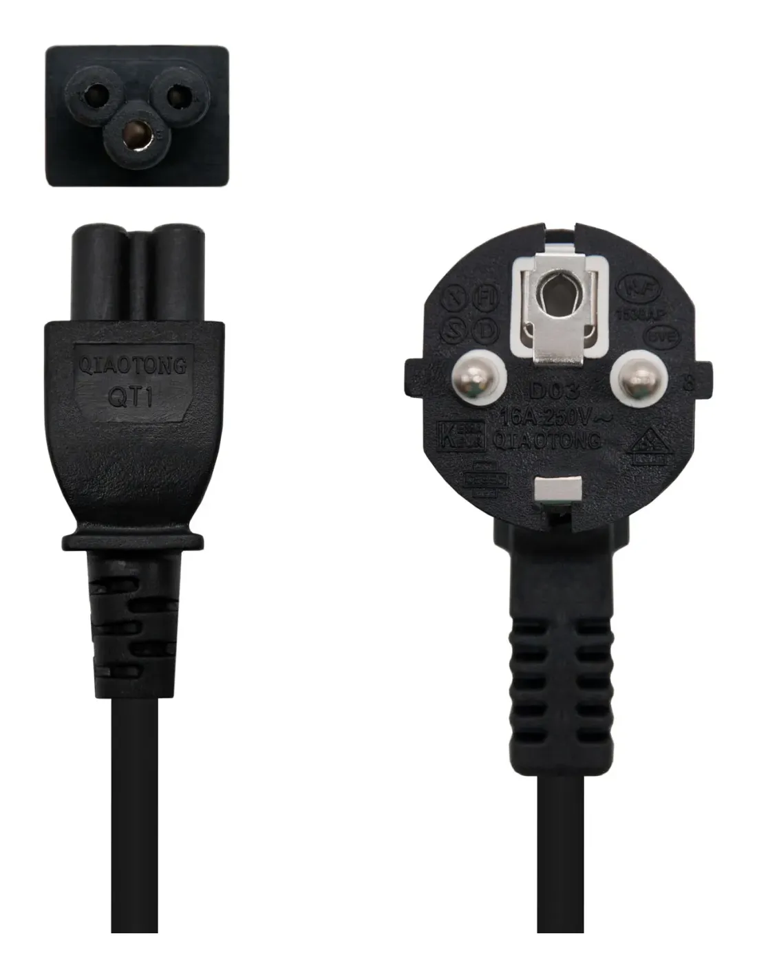 Conector CEE7 macho en un extremo y C5 hembra en el otro.