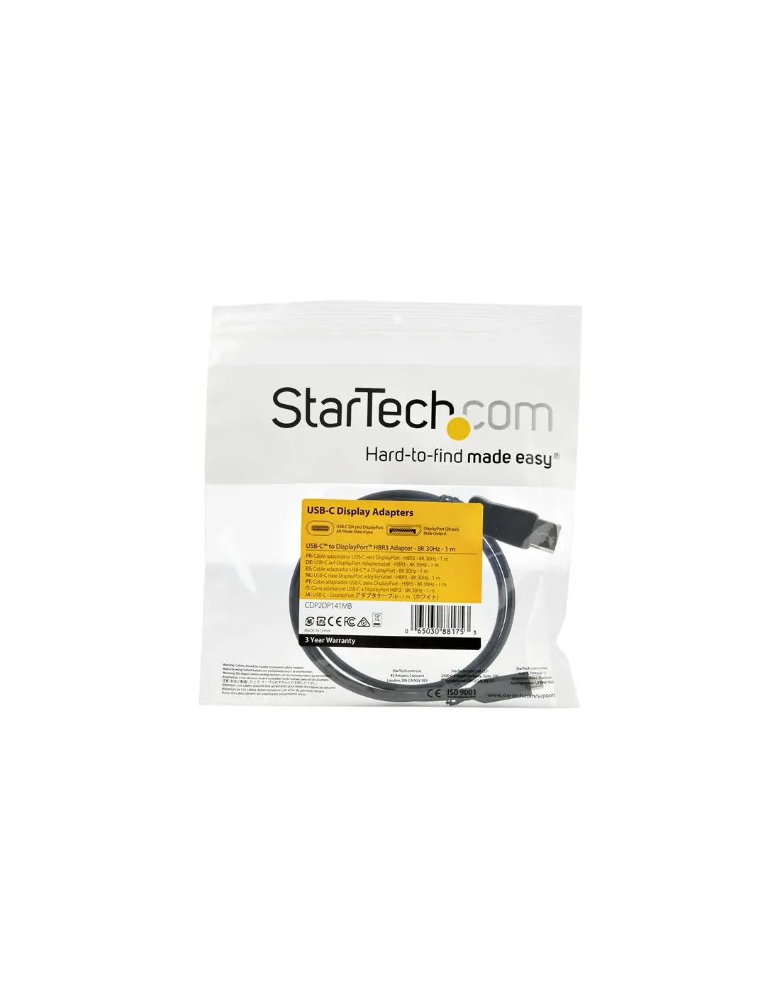 Características del StarTech.com Cable USB-C a DisplayPort 8K 1m (CDP2DP141MB)El **adaptador de vídeo StarTech.com CDP2DP141MB** es la solución ideal para profesionales que necesitan conectar dispositivos USB-C o Thunderbolt 3 a pantallas DisplayPort de alta resolución. Diseñado para ofrecer una transmisión de imagen ultra nítida, este cable soporta resoluciones de hasta **8K a 30 Hz** y es compatible con **DisplayPort 1.4** y modo alternativo DisplayPort.Con una longitud de 1 metro y construcción de calidad profesional, este adaptador es perfecto para estaciones de trabajo modernas, configuraciones de presentaciones o espacios de trabajo que requieren **alta fidelidad visual y compatibilidad con tecnologías actuales**.Conectividad avanzada y resolución 8KEste cable adaptador permite transmitir contenido de ultra alta definición desde tu dispositivo USB-C o Thunderbolt 3 directamente a un monitor o proyector con entrada DisplayPort. Ideal para tareas gráficas, edición de vídeo o cualquier aplicación que requiera **precisión visual y amplio ancho de banda**.Soporta resoluciones de hasta 7680 x 4320 a 30 Hz (8K UHD)Compatible con HBR3 para mayor tasa de transferenciaAdmite modo alternativo DisplayPort a través de USB-CDiseño compacto y garantía de confianzaEl adaptador viene en un formato de cable integrado de 1 metro, con conectores duraderos y acabados en negro para un estilo discreto y profesional. Además, cuenta con una garantía limitada de 3 años ofrecida por StarTech.com, lo que respalda su fiabilidad a largo plazo.Longitud del cable: 1 metroColor: NegroGarantía limitada: 3 añosCompatibilidad y estándaresGracias a su conformidad con los estándares DisplayPort 1.4 y compatibilidad con Thunderbolt 3, este adaptador es apto para una amplia gama de dispositivos modernos, incluyendo estaciones de trabajo, portátiles y docks como el modelo TB4CDOCK.Compatible con Thunderbolt 3Conforme a la norma DisplayPort 1.4Diseñado para el modelo TB4CDOCK y otros dispositivos USB-C con DP Alt ModeOtras especificacionesTipo de dispositivo: Adaptador de vídeo externoTipo de bus: USB-CConector de salida: DisplayPort (macho)Funciones adicionales: Compatibilidad con pantalla 8K, soporte HBR3