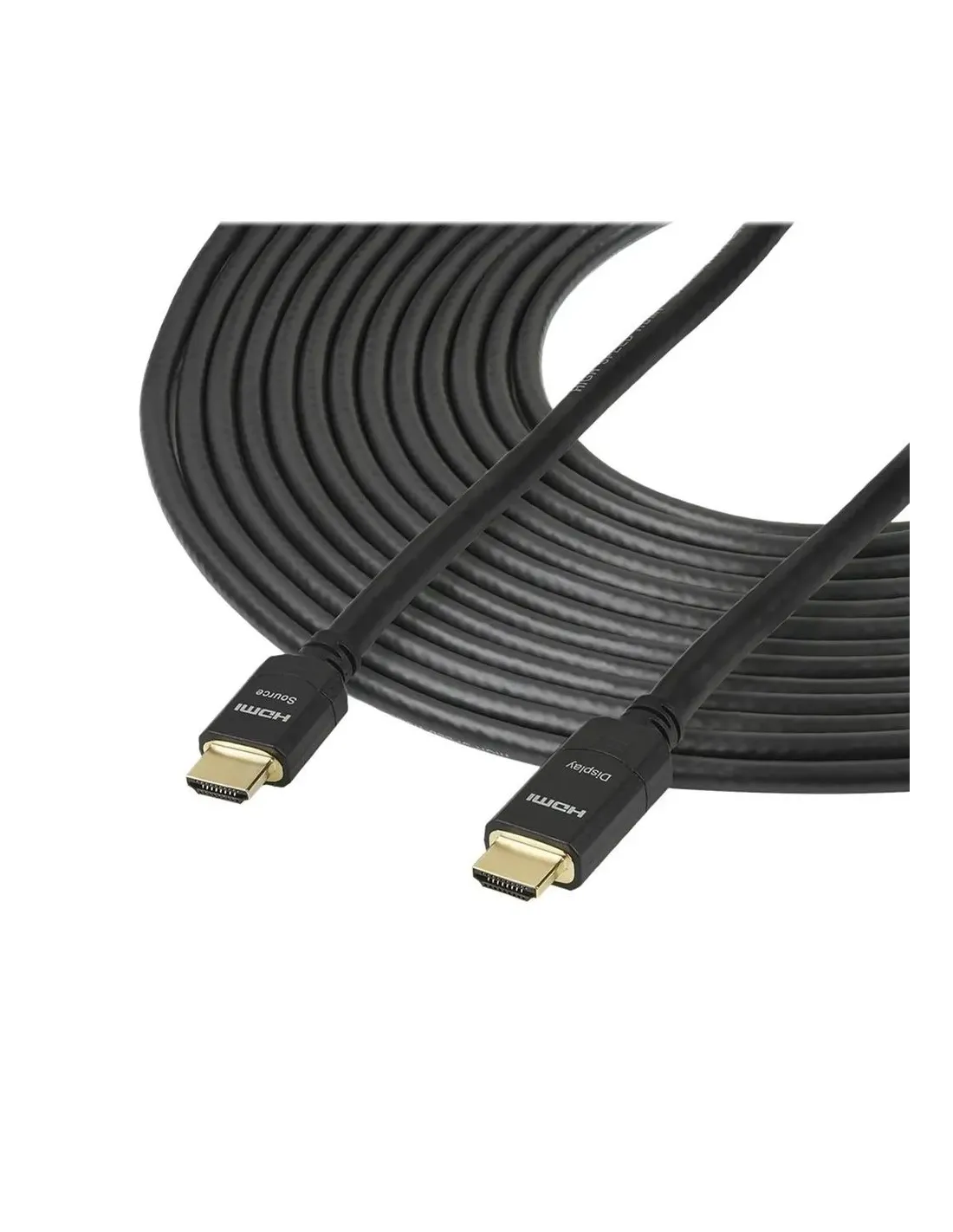 Características del StarTech.com Cable HDMI Activo de Alta Velocidad 20m (HDMM20MA)El **cable HDMI activo StarTech.com HDMM20MA** está diseñado para ofrecer una transmisión de señal fiable en instalaciones de largo alcance, siendo ideal para **configuraciones profesionales, salas de conferencias, sistemas de entretenimiento en casa o instalaciones educativas**. Con una longitud de 20 metros, cumple con los estándares de **alta velocidad HDMI** y está preparado para resoluciones **Ultra HD 4Kx2K**, asegurando compatibilidad y rendimiento incluso a distancias prolongadas.Diseño activo para instalaciones exigentesEste cable cuenta con un **repetidor de señal integrado** que mantiene la calidad de transmisión a lo largo de sus 20 metros, lo que lo hace ideal para **instalaciones a través de paredes** o techos. Además, está clasificado como **CL2**, lo que lo hace seguro para instalaciones permanentes en interiores según los códigos eléctricos.Longitud: 20 metrosClasificación CL2 para instalación en paredCompatible con resolución Ultra HD 4Kx2KCalidad de construcción y materialesConstruido con **materiales de alta calidad**, este cable HDMI utiliza **conectores chapados en oro** que mejoran la conductividad y reducen la corrosión. Su estructura **doblemente blindada** con lámina de mylar de aluminio y trenzado proporciona una protección eficaz contra interferencias electromagnéticas, asegurando una transmisión de señal limpia y sin pérdidas.Conectores HDMI tipo A macho en ambos extremosBlindaje doble: lámina de aluminio + trenzadoRevestimiento exterior de PVC resistenteCompatibilidad y normativasEl HDMM20MA cumple con las principales normativas de seguridad y medio ambiente, como **FCC y RoHS**, lo que garantiza su fiabilidad y cumplimiento normativo en distintos entornos profesionales y residenciales.Cumple con FCC y RoHSSoporta especificaciones HDMI de alta velocidadIdeal para conexiones AV, proyectores, monitores y TVsOtras especificacionesColor: NegroMaterial del cable: PVCTecnología del cable: Doble blindajeTipo de cable: HDMI activoCalibre del conductor: 24AWG