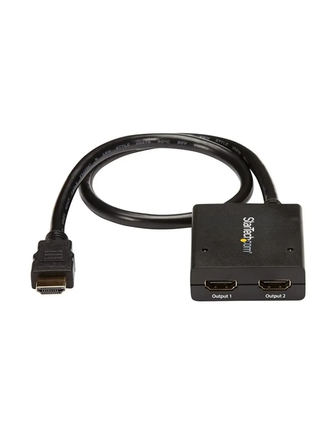 Características del StarTech.com Multiplicador de Vídeo HDMI de 2 PuertosEl **multiplicador HDMI de 2 puertos de StarTech.com** es la solución ideal para quienes necesitan **duplicar señales de vídeo y audio digital** en alta definición a través de dos pantallas HDMI simultáneamente. Diseñado para entornos profesionales, salas de reuniones, puntos de venta o uso doméstico avanzado, este dispositivo permite transmitir contenido de un solo origen HDMI hacia **dos monitores o televisores**, sin pérdida de calidad ni interrupciones.Distribución fiable en resolución 4KEste divisor HDMI permite una salida de señal de **hasta 3840 x 2160 píxeles a 30 Hz**, lo que garantiza una **experiencia visual nítida y detallada**. Es compatible con una amplia gama de dispositivos fuente, como reproductores multimedia, ordenadores, consolas o decodificadores.Resolución máxima: 3840 x 2160 @ 30 HzCompatible con pantallas y televisores 4K UHDIdeal para presentaciones, demostraciones o señalización digitalConectividad HDMI simple y eficienteGracias a su diseño compacto y funcional, integra **una entrada HDMI y dos salidas HDMI**, facilitando una instalación sin complicaciones. El divisor opera de forma totalmente plug & play, sin necesidad de software adicional.1 entrada HDMI + 2 salidas HDMIPlug & Play: sin configuraciones ni controladoresIncluye cable de alimentación USB para mayor versatilidadDiseño compacto y alimentación flexibleSu formato sobremesa y su reducido tamaño permiten **colocarlo fácilmente en cualquier espacio**, sin interferir con otros equipos. Además, incluye un **transformador externo** para una alimentación estable, compatible también con puertos USB.Dimensiones: 5 cm (ancho) x 1,8 cm (alto) x 62 cm (profundidad)Peso ligero: solo 78 gAlimentación por transformador externo o vía USBConstruido según estándares de calidadEste dispositivo cumple con normativas internacionales como **FCC y RoHS**, lo que garantiza seguridad y respeto medioambiental en su fabricación y uso.Cumplimiento de normas: FCC, RoHSMateriales seguros y de alta calidadOtras especificacionesTipo de dispositivo: Separador de vídeo/audio HDMI (2 puertos)Subtipo: HDMITipo de caja: Sobremesa
