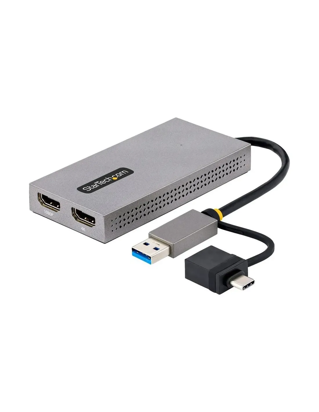 Características del StarTech.com Adaptador Convertidor USB 3.0 a 2 Pantallas HDMIEl adaptador de vídeo StarTech.com USB 3.0 a doble HDMI es una solución práctica y versátil para ampliar tu espacio de trabajo conectando hasta dos pantallas HDMI adicionales desde un solo puerto USB. Diseñado para usuarios profesionales, entornos de oficina o configuraciones multitarea, permite mejorar la productividad con una instalación sencilla y compatibilidad con Windows y Mac.Expansión de pantalla dual en alta resoluciónEste adaptador permite conectar dos monitores HDMI simultáneamente, facilitando la gestión de múltiples ventanas, aplicaciones o contenidos. Gracias a su compatibilidad con resolución 4K (3840 x 2160), ofrece una calidad de imagen nítida y detallada para tareas profesionales, presentaciones o consumo multimedia.Salida de vídeo: hasta 3840 x 2160 píxelesFrecuencia de actualización: 30 Hz2 salidas HDMI tipo A de 19 pinesConectividad versátil y amplia compatibilidadEl dispositivo incorpora conexiones USB Tipo A y USB-C, lo que garantiza su compatibilidad con una amplia gama de equipos modernos y tradicionales. Es compatible con los principales sistemas operativos, facilitando su uso tanto en entornos profesionales como domésticos.Entrada USB Tipo A de 9 clavijasEntrada USB-C de 24 pinesCompatible con Windows 7 / 8.1 / 10 / 11Compatible con macOS (Mojave, Catalina, Big Sur, Monterey, Ventura)Compatible con Chrome OSInstalación sencilla y alimentación por USBGracias a su alimentación directa por USB, no requiere fuentes de energía externas, lo que simplifica su instalación y uso diario. Integra el chipset Silicon Motion SM768, optimizado para ofrecer un rendimiento estable en la transmisión de vídeo.Alimentación mediante USBChipset Silicon Motion SM768Instalación rápida sin hardware adicionalDiseño compacto y fiableSu diseño en color gris, compacto y ligero, lo convierte en un accesorio fácil de transportar y perfecto para espacios de trabajo reducidos. Además, cumple con normativas internacionales que garantizan su seguridad y eficiencia.Dimensiones: 10 x 5 x 1.5 cmPeso: 83 gCumplimiento de normas: RoHS, WEEE, HDCPGarantía limitada de 3 añosOtras especificacionesInterfaz: USB 3.2 Gen 1Tipo de adaptador: convertidor de vídeo USB a HDMIColor: gris
