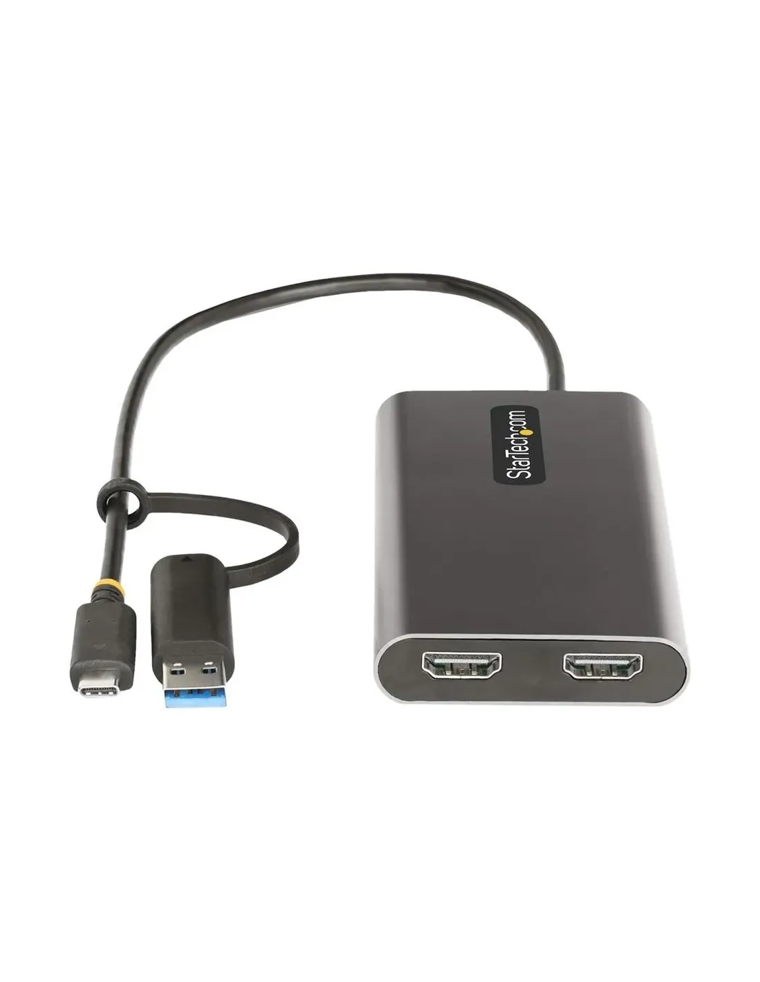 Características del StarTech.com USB-C to Dual HDMI Adapter 4K 60Hz (109B-USBC-HDMI)El adaptador de vídeo StarTech.com USB-C a doble HDMI es una solución versátil y profesional para quienes necesitan ampliar su espacio de trabajo con dos monitores externos desde un portátil o equipo compatible. Diseñado para ofrecer calidad de imagen 4K a 60 Hz, este adaptador es ideal tanto para entornos de oficina como para usuarios exigentes que trabajan con contenido visual o multitarea intensiva.Salida de vídeo dual 4K para máxima productividadGracias a sus dos salidas HDMI, este adaptador permite conectar hasta dos pantallas externas con resolución ultra alta, mejorando significativamente la productividad. Es perfecto para configuraciones multimonitor en entornos profesionales.2 x HDMI tipo A de 19 pines (hembra)Resolución máxima: 3840 x 2160 (4K)Frecuencia de actualización: 60 HzConectividad flexible USB-C y USB-AEste modelo ofrece compatibilidad con USB-C y USB-A, lo que lo convierte en una opción muy versátil para diferentes dispositivos. Incluye un cable integrado que facilita su uso inmediato sin necesidad de accesorios adicionales.Conector USB-C (24 pines) - machoConector USB Tipo A (9 pines) - machoCable integrado de 30 cmSuministro de energía de hasta 100 WEl adaptador incorpora paso de energía (Power Delivery) de hasta 100 W, permitiendo alimentar el portátil mientras se utiliza el adaptador. Esto evita la necesidad de desconectar el cargador y garantiza un uso continuo sin interrupciones.Power Delivery de hasta 100 WAlimentación por bus USBAdaptador de alimentación USB-C para hostDiseño compacto y resistenteSu carcasa de aluminio no solo aporta un acabado profesional, sino que también mejora la durabilidad y la disipación del calor. Su tamaño compacto lo hace ideal para transportar y usar en cualquier lugar.Material: aluminioColor: grisPeso: 121 gDimensiones: 11.3 x 2.4 x 1.5 cmAmplia compatibilidad y certificacionesEste adaptador está certificado por DisplayLink y es compatible con una amplia gama de sistemas operativos, lo que garantiza un funcionamiento estable en distintos entornos. Además, cumple con normativas internacionales de calidad y seguridad.Compatible con Windows 7 / 8 / 10 / 11Compatible con macOS (El Capitan hasta Ventura 13)Compatible con Ubuntu y Chrome OSCertificaciones: FCC, RoHS, WEEE, UKCA, DisplayLinkCompatible con TAAOtras especificacionesTipo: Adaptador de vídeo activo compatible con 4KInterfaz: HDMI / USB (USB 3.2 Gen 1)Longitud del cable: 30 cmGarantía: 3 años