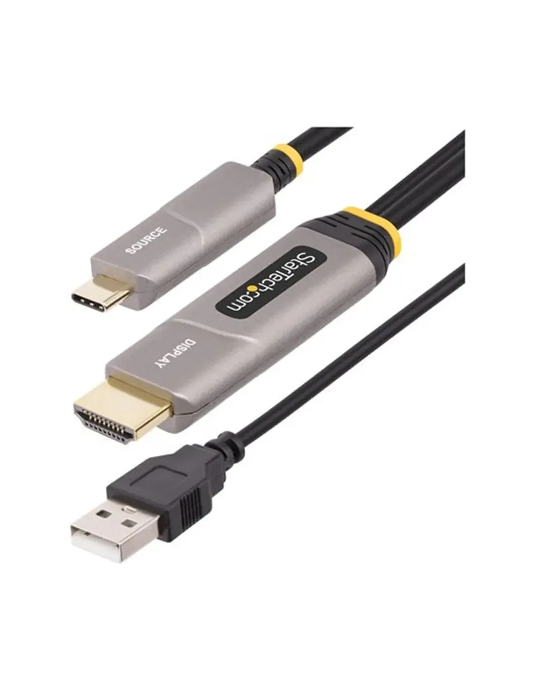 Características del StarTech.com Cable Activo Óptico USB-C a HDMI 2.0 (AOC) de 9,1 m - 4K 60HzEl cable activo óptico USB-C a HDMI 2.0 de StarTech.com está diseñado para ofrecer transmisión de vídeo 4K a 60 Hz sin pérdidas en largas distancias. Gracias a su tecnología AOC (Active Optical Cable), combina fibra óptica y apantallado para garantizar una señal estable, incluso en instalaciones exigentes. Es una solución ideal para entornos profesionales, salas de conferencias o setups multimedia avanzados que requieren calidad de imagen y fiabilidad.Transmisión 4K profesional sin interferenciasEste cable permite disfrutar de resoluciones 4K UHD (3840 x 2160) a 60 Hz con una calidad de imagen nítida y fluida. La fibra óptica multimodo integrada reduce las interferencias electromagnéticas (EMI), asegurando una transmisión estable incluso en largas distancias.Resolución máxima: 4K 60Hz (3840 x 2160)Submuestreo de croma 4:4:4Compatibilidad con HDR y HDR10Protección contra interferencias EMITecnología AOC: rendimiento superior en largas distanciasGracias a su diseño activo y unidireccional, este cable convierte la señal eléctrica en óptica para mantener la calidad a lo largo de sus 9,15 metros de longitud. Es perfecto para instalaciones donde los cables tradicionales no alcanzan o pierden calidad.Longitud: 9,15 mTecnología Active Optical Cable (AOC)Fibra óptica multimodo OM3Diseño unidireccionalCompatibilidad avanzada y conectividad versátilEl cable es compatible con dispositivos USB-C que soportan modo alternativo DisplayPort, permitiendo conectar portátiles, tablets o estaciones de trabajo a pantallas HDMI. Además, incorpora alimentación USB para asegurar un funcionamiento estable.Conector USB-C (entrada)HDMI tipo A (salida)USB-A adicional para alimentaciónCompatible con Windows, macOS, Linux y Chrome OSAudio envolvente y funciones HDMI completasNo solo transmite vídeo de alta calidad, también admite audio envolvente 7.1 y funciones avanzadas como ARC y CEC, facilitando el control y la integración en sistemas multimedia.Canal de audio 7.1Audio Return Channel (ARC)Compatibilidad HDMI CECSoporte TMDSDiseño robusto y preparado para instalacionesSu construcción con revestimiento de PVC, diámetro reducido y certificación CL3 lo hacen adecuado para instalaciones en pared. Además, cuenta con alivio de tensión para mejorar la durabilidad.Color: NegroMaterial: PVCDiámetro exterior: 4,5 mmCertificación CL3 para instalacionesOtras especificacionesProfundidad de color: 8 y 10 bitsHDCP 1.2 y 1.4Normativas: FCC, RoHS, WEEEGarantía: 3 años