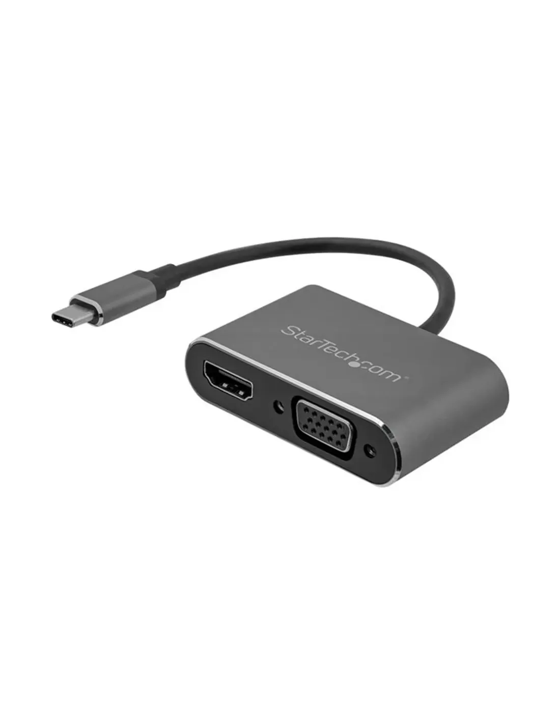 Características del StarTech.com Adaptador USB-C a VGA y HDMI 2 en 1 4K 30Hz Gris EspacialEl adaptador USB-C a VGA y HDMI de StarTech.com es una solución práctica y versátil para quienes necesitan conectar su equipo a múltiples pantallas desde un único puerto USB Tipo C. Diseñado para entornos profesionales, educativos o de trabajo remoto, este adaptador permite ampliar o duplicar la imagen con calidad hasta 4K, ofreciendo compatibilidad tanto con monitores modernos como con pantallas VGA más tradicionales.Conectividad dual: HDMI y VGA en un solo adaptadorGracias a su diseño 2 en 1, este adaptador permite conectar simultáneamente dispositivos mediante salida HDMI y VGA, facilitando la integración en distintos entornos de trabajo. Es ideal para presentaciones, estaciones de trabajo o configuraciones multimonitor.Salida HDMI (conector hembra)Salida VGA (conector hembra)Compatible con sistemas modernos y monitores legacyResolución 4K para una visualización nítidaDisfruta de una experiencia visual de alta calidad gracias a su compatibilidad con resoluciones hasta 3840 x 2160 a 30 Hz en HDMI. Además, la salida VGA admite resoluciones de hasta 1920 x 1200, asegurando una buena definición en distintos tipos de pantalla.HDMI: hasta 3840 x 2160 a 30 Hz (4K)VGA: hasta 1920 x 1200Compatible con contenido HD y 4KMotor gráfico integrado IT6222Este adaptador incorpora el chip gráfico IT6222, que garantiza una transmisión de señal estable y eficiente. Además, es compatible con sonido envolvente 5.1 a través de HDMI, ofreciendo una experiencia multimedia completa.Chipset IT6222Soporte de audio 5.1 en HDMITransmisión de señal estableDiseño compacto y listo para llevarSu formato compacto y ligero, junto con el acabado en gris espacial, lo convierten en un accesorio fácil de transportar y elegante. Incluye un cable USB-C integrado de 15,24 cm, ideal para conexiones rápidas sin necesidad de accesorios adicionales.Dimensiones: 6.2 x 3.6 x 1.6 cmPeso: 90 gCable USB-C incluido (15,24 cm)Fiabilidad y garantía profesionalStarTech.com ofrece un producto fiable y duradero, respaldado por una garantía limitada de 3 años y cumplimiento de normativas internacionales, lo que asegura su uso en entornos profesionales exigentes.Garantía de 3 añosCertificaciones: FCC, RoHS, WEEETemperatura de funcionamiento: 0 °C a 45 °COtras especificacionesTipo de dispositivo: Adaptador de vídeo externoTipo de bus: USB-CHumedad de funcionamiento: 5% - 90%Color: Gris espacial