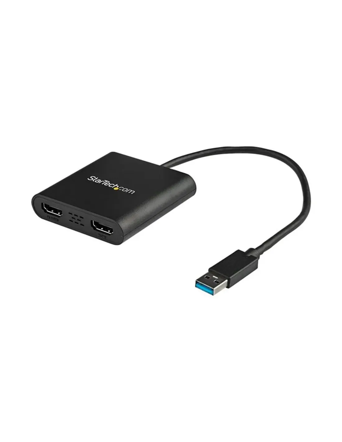 Características del StarTech.com Adaptador Gráfico USB 3.0 a 2x HDMIEl adaptador gráfico externo StarTech.com USB 3.0 a doble HDMI es una solución práctica y eficiente para ampliar o duplicar la pantalla de tu ordenador sin necesidad de abrir el equipo. Diseñado para usuarios que necesitan mayor productividad, permite conectar hasta dos monitores adicionales mediante un solo puerto USB, ofreciendo compatibilidad con resolución 4K a 30 Hz en un formato compacto y fácil de usar.Expansión de pantalla con doble salida HDMIEste adaptador permite añadir dos salidas HDMI independientes, ideal para entornos de trabajo multitarea, oficinas o setups profesionales donde se requiere más espacio visual. Mejora la productividad al facilitar el uso simultáneo de varias aplicaciones.2 x HDMI tipo A de 19 pines (salida)Conexión mediante USB 3.0 tipo A (entrada)Compatible con múltiples monitores externosCalidad de imagen en alta resoluciónDisfruta de una experiencia visual nítida gracias a su compatibilidad con resolución 4K (3840 x 2160) a 30 Hz. Es ideal para tareas de oficina, reproducción multimedia o presentaciones donde la claridad de imagen es fundamental.Resolución máxima: 3840 x 2160Frecuencia de actualización: 30 HzSoporte para contenido en alta definiciónInstalación sencilla y compatibilidad garantizadaGracias a su diseño plug & play y compatibilidad con sistemas Windows, este adaptador se integra fácilmente en tu entorno sin complicaciones. Además, cumple con múltiples normativas que garantizan su fiabilidad y seguridad.Compatible con Windows 7, 8.1 y 10 (32/64 bits)Certificaciones: WHQL, FCC, RoHSCompatible con TAADiseño compacto y funcionalSu formato ligero y cable integrado de 25 cm facilita su transporte y uso en cualquier entorno, siendo una opción ideal tanto para escritorio como para movilidad. Su construcción robusta asegura durabilidad en el uso diario.Longitud del cable: 25 cmColor: negroPeso: 56 gOtras especificacionesMemoria integrada: 64 MBInterfaz soportada: HDMI / USB 3.0Dimensiones: 6.6 cm (ancho) x 1.5 cm (alto)