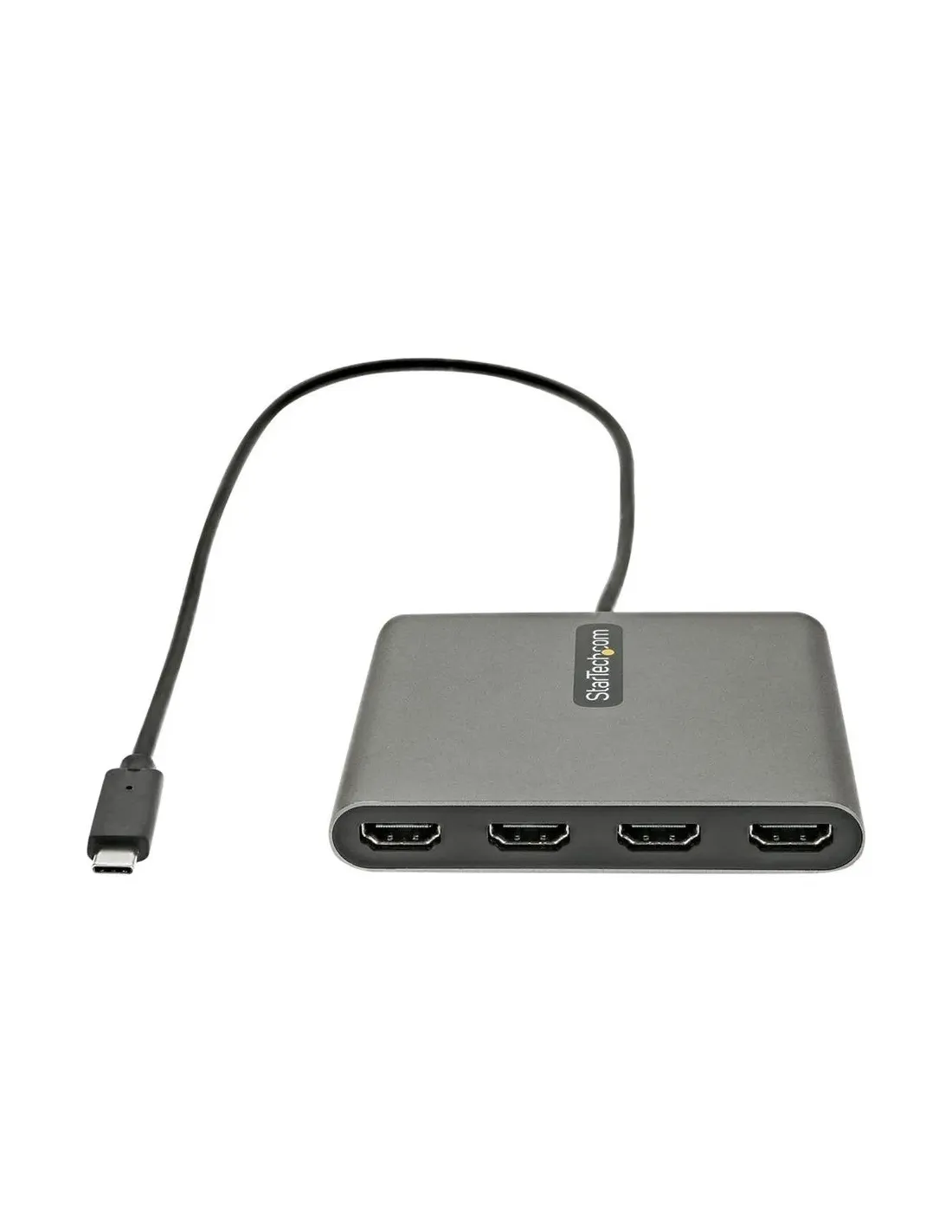 Características del StarTech.com Adaptador USB-C a 4 Puertos HDMI USBC2HD4El adaptador USB-C a 4 HDMI StarTech.com USBC2HD4 es una solución avanzada para usuarios que necesitan expandir su espacio de trabajo con múltiples pantallas desde un solo puerto USB-C. Diseñado especialmente para entornos profesionales, este conversor permite conectar hasta cuatro monitores HDMI con resolución Full HD, facilitando una experiencia multitarea eficiente y organizada en sistemas Windows.Expansión a cuatro pantallas HDMIEste adaptador funciona como una tarjeta gráfica externa, permitiendo conectar hasta cuatro monitores adicionales a través de sus salidas HDMI. Es ideal para tareas que requieren alta productividad, como edición, análisis de datos o configuraciones multiventana.4 salidas HDMI tipo A (19 pines) hembraResolución máxima: 1920 x 1080 (Full HD)Frecuencia de actualización: 60 HzConexión USB-C rápida y sencillaGracias a su conector USB Tipo C, este dispositivo ofrece una instalación rápida sin necesidad de hardware adicional complejo. Su funcionamiento como adaptador gráfico externo permite ampliar la conectividad de equipos compatibles de forma eficiente.Conector USB-C macho de 24 pinesCompatible con sistemas Windows 10Alimentación directa mediante USBDiseño compacto y materiales de calidadSu carcasa de aluminio en color gris espacio proporciona mayor durabilidad y una mejor disipación del calor, manteniendo un diseño elegante y profesional. Además, su tamaño compacto facilita el transporte y la integración en cualquier entorno de trabajo.Carcasa de aluminio resistenteColor: gris espacioDiseño compacto y ligeroCable integrado para mayor comodidadEl adaptador incluye un cable integrado de 50 cm, lo que permite una conexión flexible sin necesidad de accesorios adicionales, facilitando su uso tanto en escritorio como en configuraciones más dinámicas.Longitud del cable: 50 cmTipo: cable adaptador USB-C a HDMISoporte de vídeo hasta 1080p a 60HzOtras especificacionesDimensiones: 10.1 x 8.01 x 1.6 cmPeso: 171 gNormativas: FCC, RoHSPeso con embalaje: 285 gDimensiones del embalaje: 20.7 x 14.4 x 3.8 cm