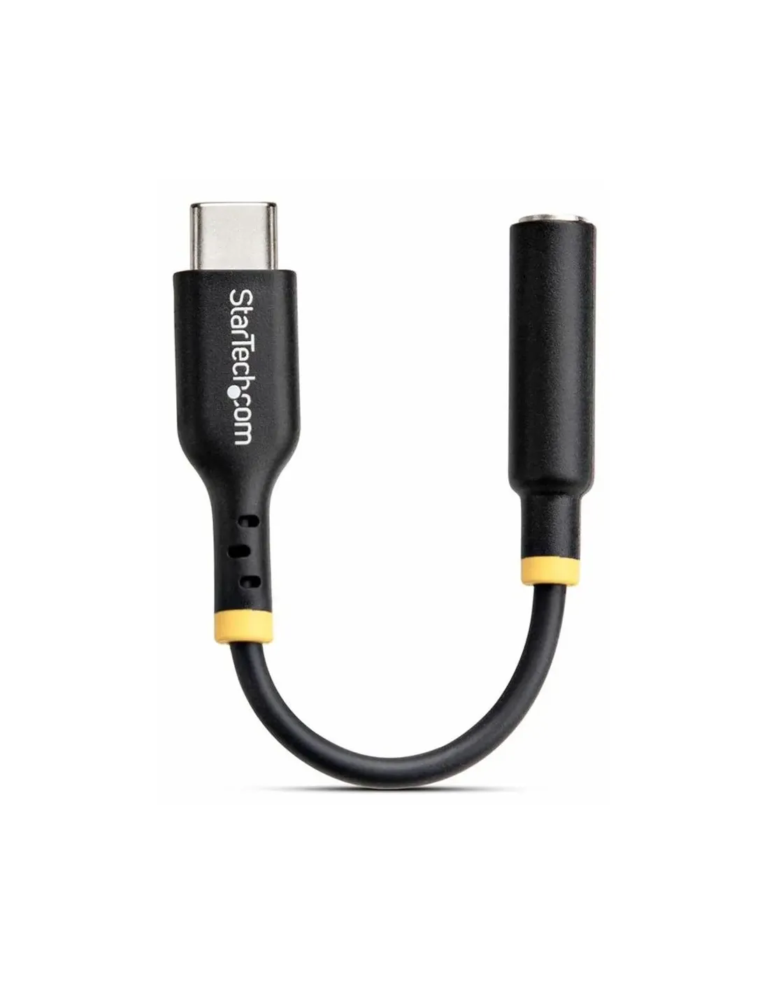 Características del StarTech.com USB-C Audio Adapter to 3.5mm TRRS JackEl adaptador de audio USB-C a jack de 3,5 mm de StarTech.com es una solución práctica y compacta para recuperar la conexión de auriculares en dispositivos modernos sin puerto auxiliar. Diseñado para smartphones, tablets y portátiles, este dongle ofrece una conversión de audio digital a analógico de alta calidad, ideal para disfrutar de tu música, llamadas o contenido multimedia con total claridad.Conversión de audio de alta calidad con DAC integradoGracias a su DAC de 32 bits con chipset Realtek ALC4030U, este adaptador garantiza una experiencia sonora nítida y precisa. Ofrece un excelente rendimiento tanto en reproducción musical como en llamadas, manteniendo una señal limpia y sin interferencias.DAC de 32 bits integradoChipset Realtek ALC4030URelación señal/ruido de 105 dBFrecuencia de respuesta: 44.1 - 384 kHzCompatibilidad universal y uso versátilEste adaptador está diseñado para ofrecer amplia compatibilidad con múltiples sistemas operativos, lo que lo convierte en una opción ideal para usuarios que trabajan o disfrutan de diferentes dispositivos. Perfecto para uso diario en movilidad o en escritorio.Compatible con Android, iOS, iPadOS, Windows 10/11 y macOSUso recomendado: teléfonos, tablets y portátilesCumple con estándares USB / USB 2.0Diseño compacto y resistenteCon un cable de solo 12,7 cm y un peso ligero de 9 g, este adaptador es fácil de transportar y perfecto para llevar siempre contigo. Su recubrimiento en elastómero termoplástico (TPE) proporciona mayor flexibilidad y durabilidad frente al uso diario.Longitud del cable: 12,7 cmPeso: 9 gMaterial: TPE resistente y flexibleColor: negroConectividad fiable y funcionalEl diseño TRRS permite soporte completo para audio y micrófono, ideal para auriculares con funciones de llamada. La conexión USB-C asegura una transmisión estable y eficiente en todo momento.Conector USB-C macho (24 pines)Salida minijack 3,5 mm TRRS hembra (4 polos)Salida de audio estéreoCompatible con estándares CTIA y OMTPOtras especificacionesCumplimiento de normas: RoHS, WEEEDimensiones del embalaje: 22 x 18 x 1,2 cmPeso del embalaje: 15 g