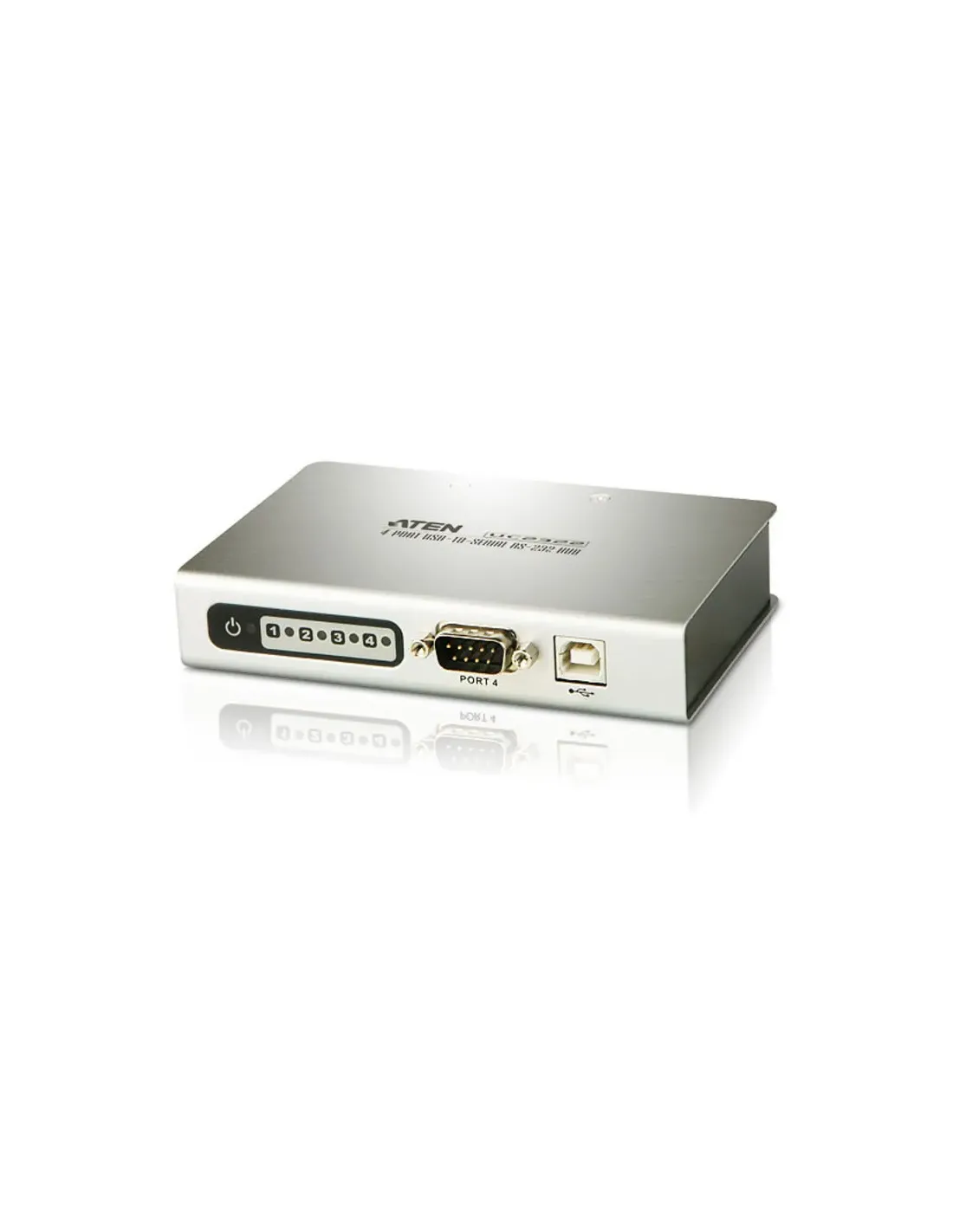 ATEN Conversor USB a 4 puertos RS-232. Interfaz de host: USB 2.0 Type-B. Color del producto: Metálico, Interfaces de concentradores: VGA, Material de la carcasa: Metal. Consumo energético: 0,4 W. Ancho: 80 mm, Profundidad: 125 mm, Altura: 25 mm. Cantidad por paquete: 1 pieza(s), Ancho del paquete: 59 mm, Profundidad del paquete: 239 mm