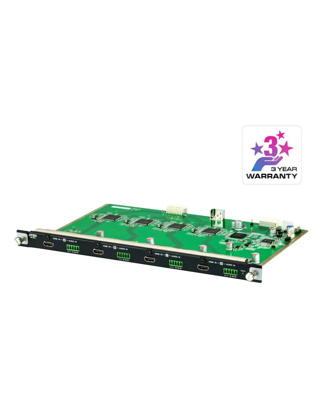ATEN Tarjeta de entrada HDMI de 4 puertos. Tipo de producto: Placa de entrada, Color del producto: Negro, Verde, Material: Metal. Consumo energético: 7 W. Ancho: 238 mm, Profundidad: 352 mm, Altura: 23,3 mm. Ancho del paquete: 285 mm, Profundidad del paquete: 426 mm, Altura del paquete: 57 mm. Cantidad por caja: 2 pieza(s), Peso del envase completo: 2,27 kg, Longitud de la caja: 440 mm